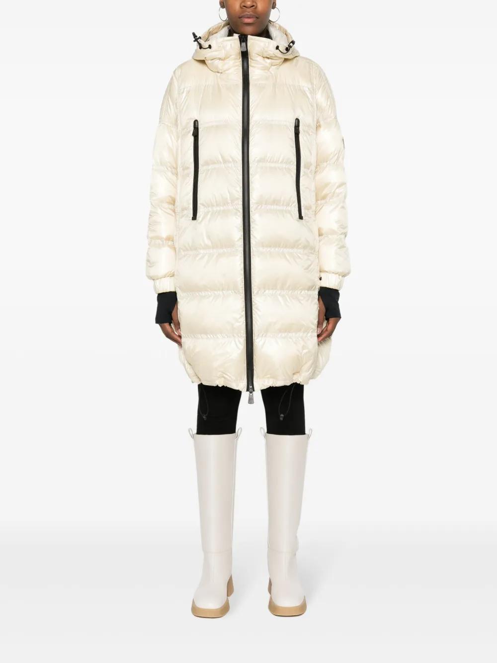 light beige goose down padded design water-repellent logo patch at the sleeve drawstring hood front two-way zip fastening long sleeves thumb slot two zip-fastening chest pockets drawstring hem knee-length