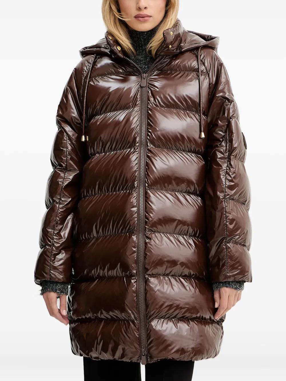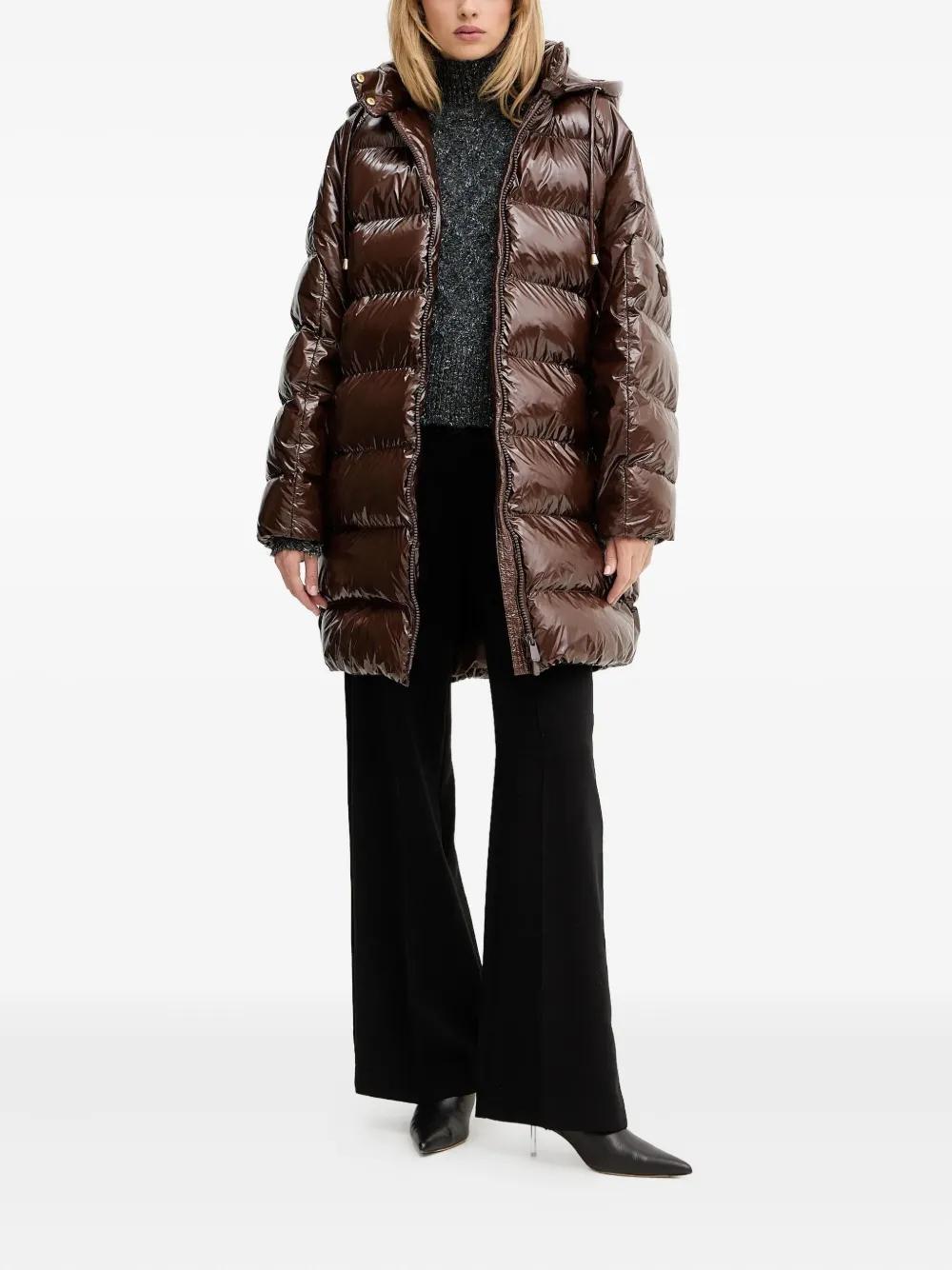 brown padded design drawstring hood front zip fastening Love Birds logo appliqué