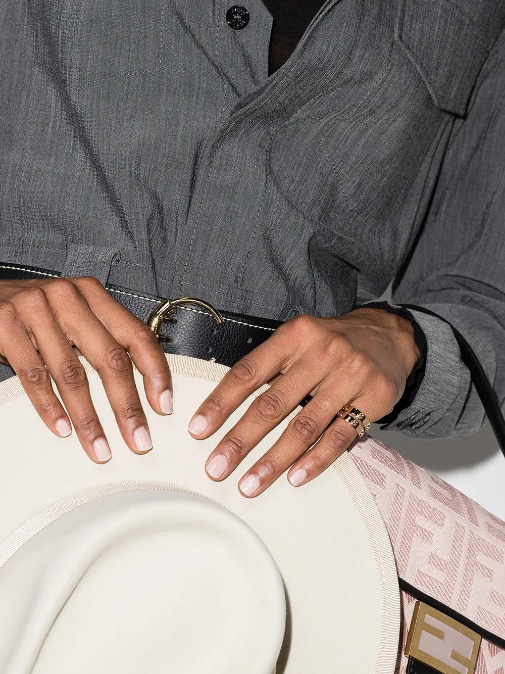 This gold tone Tory Burch raised serif T logo ring is cast from brass. Designed for a smooth finish, it is punctuated with raised details. We'd like to raise a glass to this Tory Burch ring - it's worth celebrating and also we'd like everyone to see it.