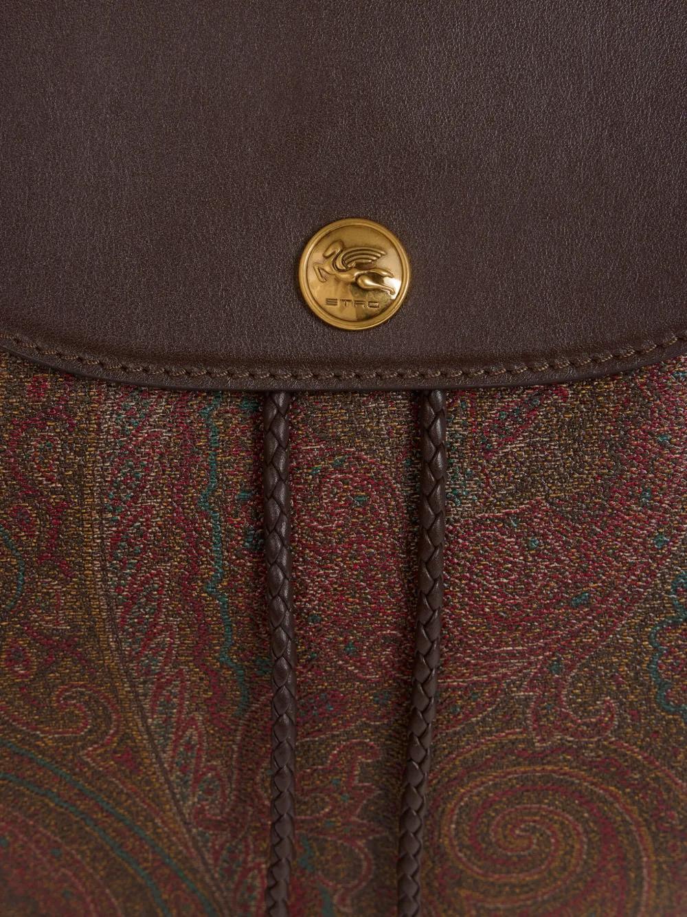 brown paisley print circular top handle adjustable shoulder straps drawstring fastening gold-tone hardware