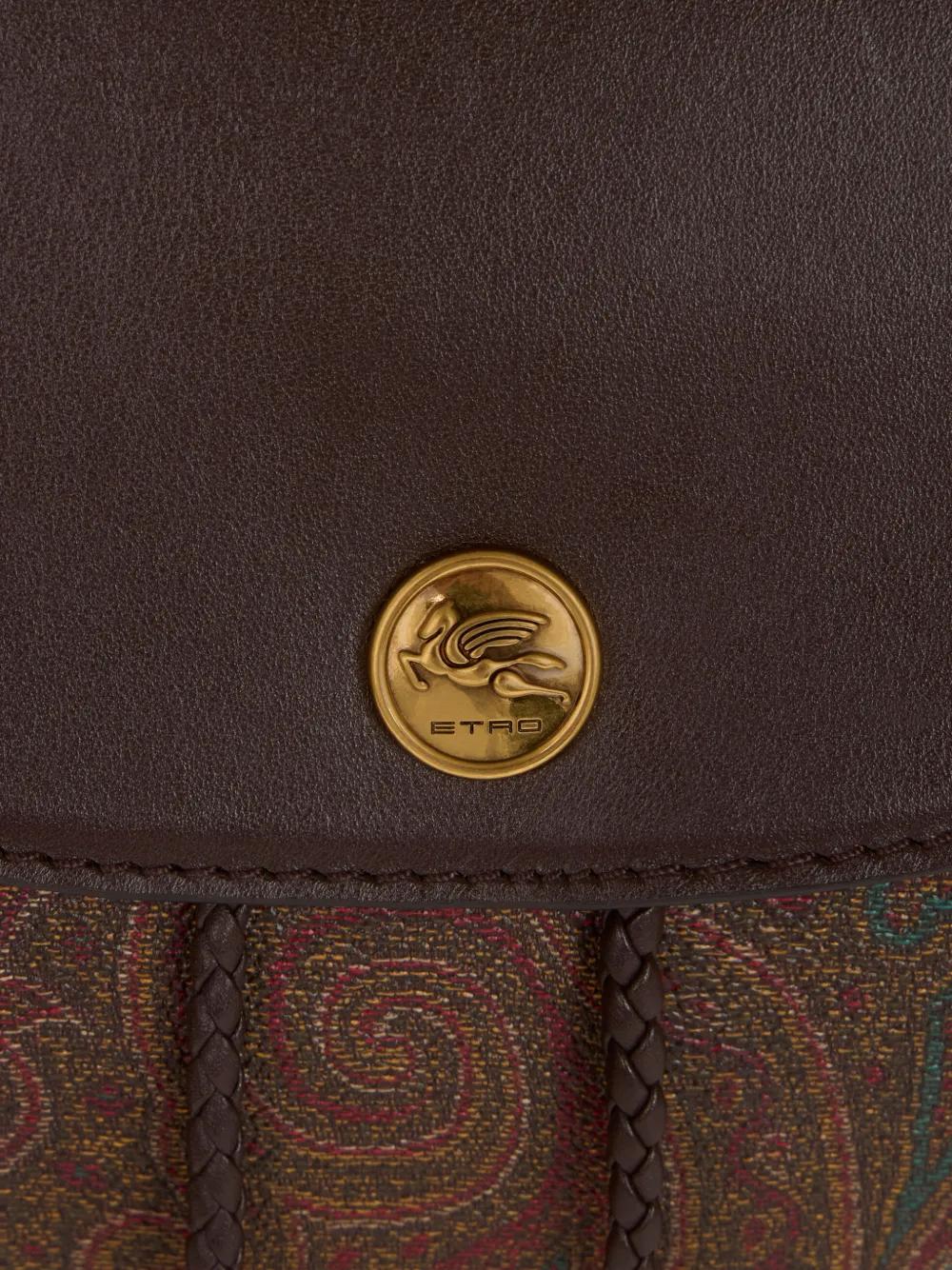 brown paisley print circular top handle adjustable shoulder straps drawstring fastening gold-tone hardware