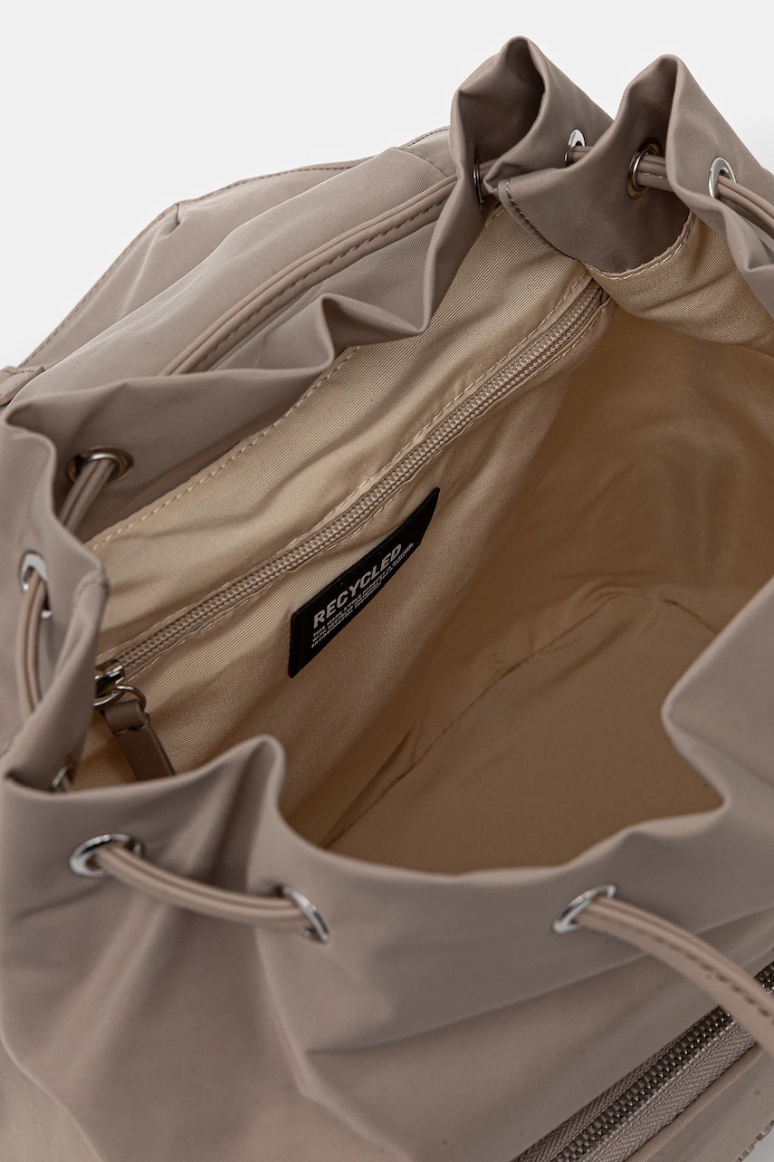 - Produkt zawiera materiały z włókien pochodzących z recyklingu. - Komora ściągana troczkami i zapinana na klamrę. - Z przodu kieszonka zapinana na suwak. - Kieszonka wewnętrzna zapinana na suwak. - Krótki uchwyt dla komfortowego noszenia w dłoni. - Regulowana długość pasków. - Nie mieści formatu A4. - Głębokość: 15 cm. - Wysokość: 30 cm. - Szerokość u podstawy: 30 cm.