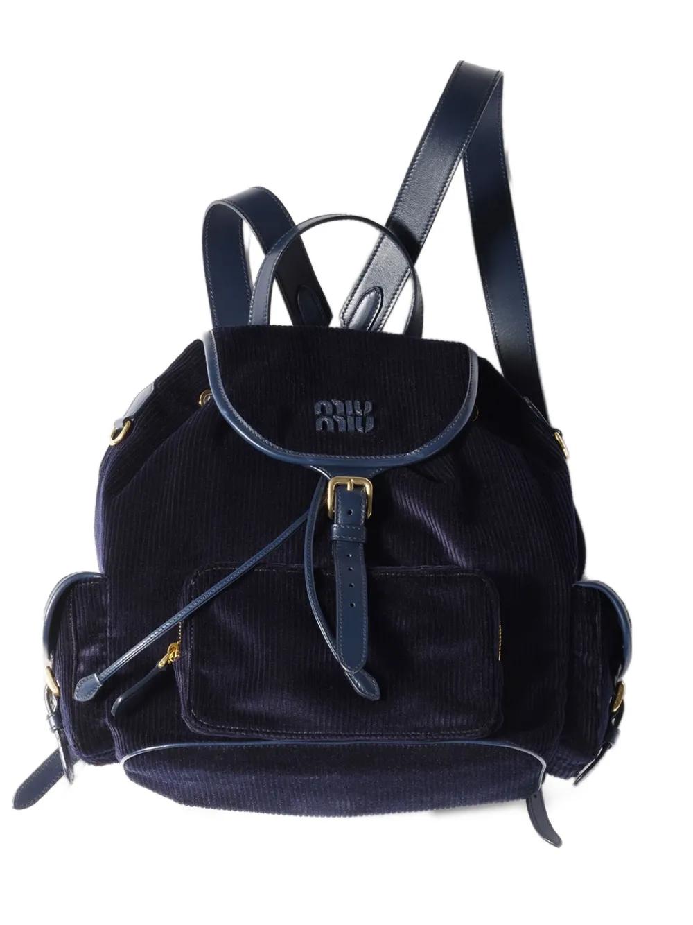 blue leather handle front zip pocket side flap pockets gold-tone hardware flap closure buckle
