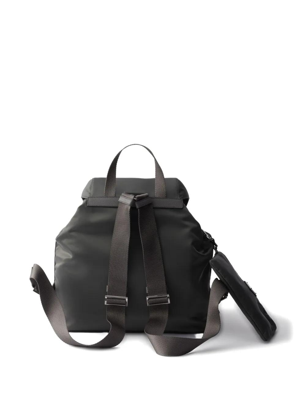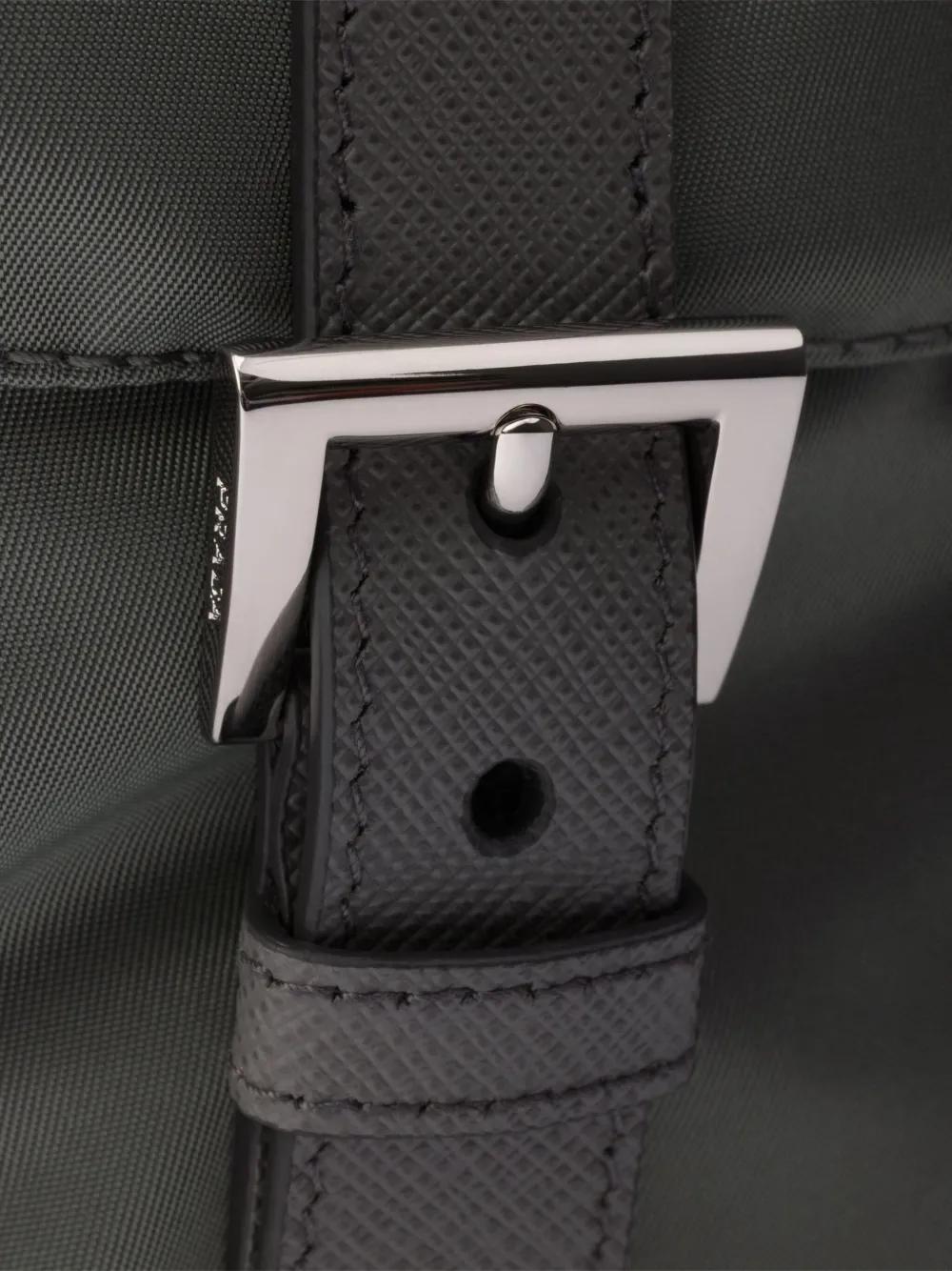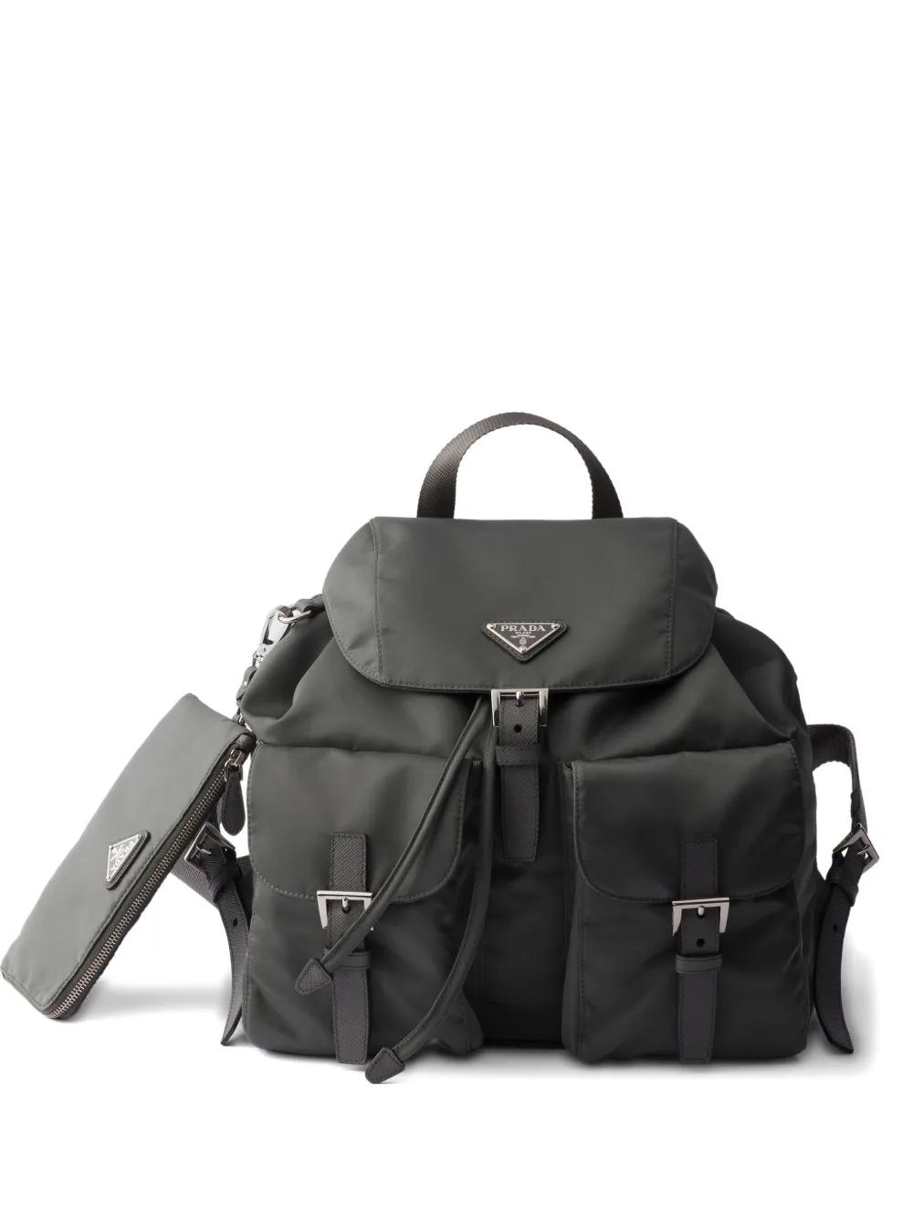 grey saffiano leather details adjustable woven shoulder straps metal hardware metal triangle logo drawstring closure
