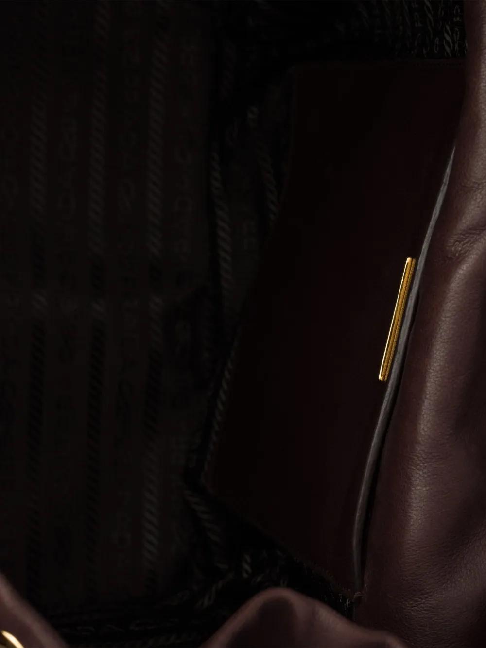brown detachable leather handle adjustable strap drawstring fastening flap top gold-tone hardware external pockets