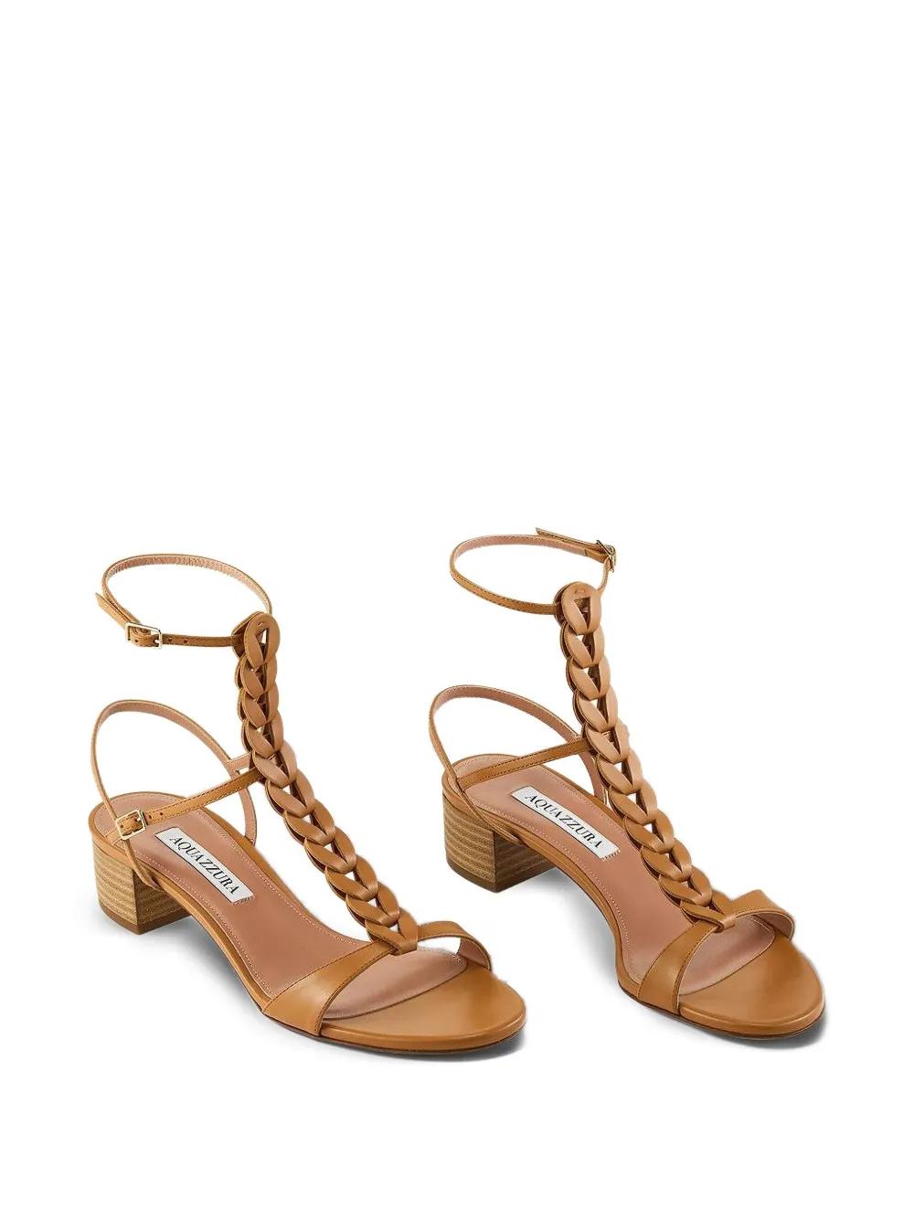 caramel brown braided leather straps ankle buckle fastening block heel open toe leather sole