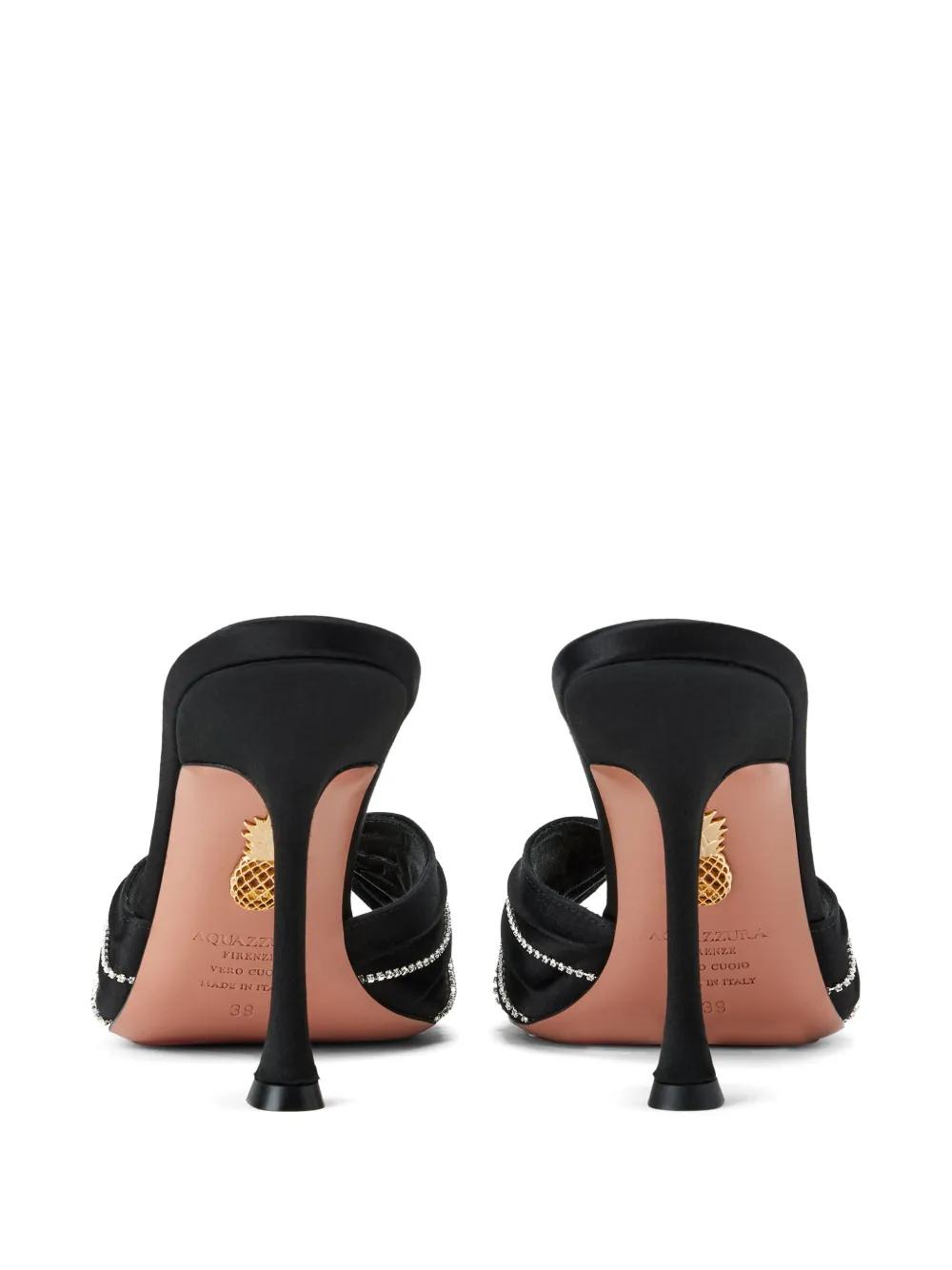 black suede crystal embellishment knot detailing signature pineapple motif round open toe open back branded leatherfootbed 95mm high heel leather sole slip-on style