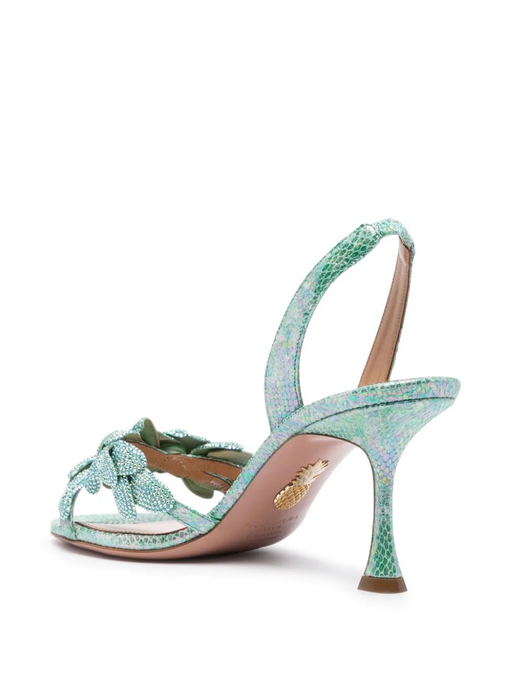 light blue calf leather snakeskin effect holographic effect almond open toe floral appliqué with rhinestone embellishment branded leather insole leather sole 75mm sculpted heel slingback strap