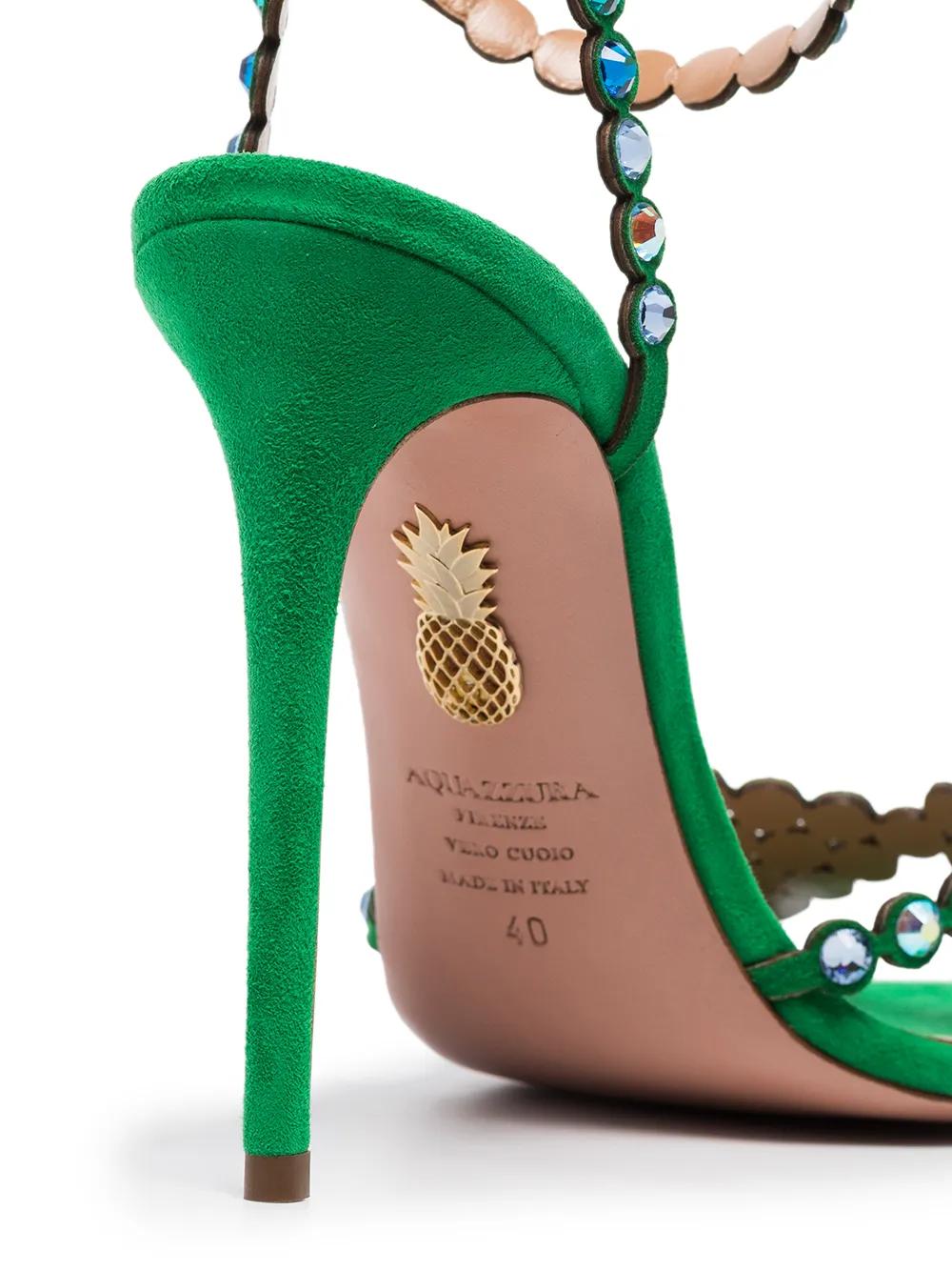 jasmine green suede crystal embellishment branded leather insole open toe buckle-fastening ankle strap 105mm high stiletto heel