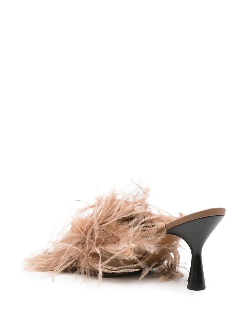 brown leather upper feather embellishment kitten heel open toe slip-on style