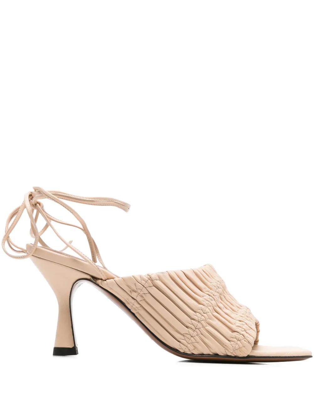 beige plissé effect calf leather ankle tie fastening open square toe low heel