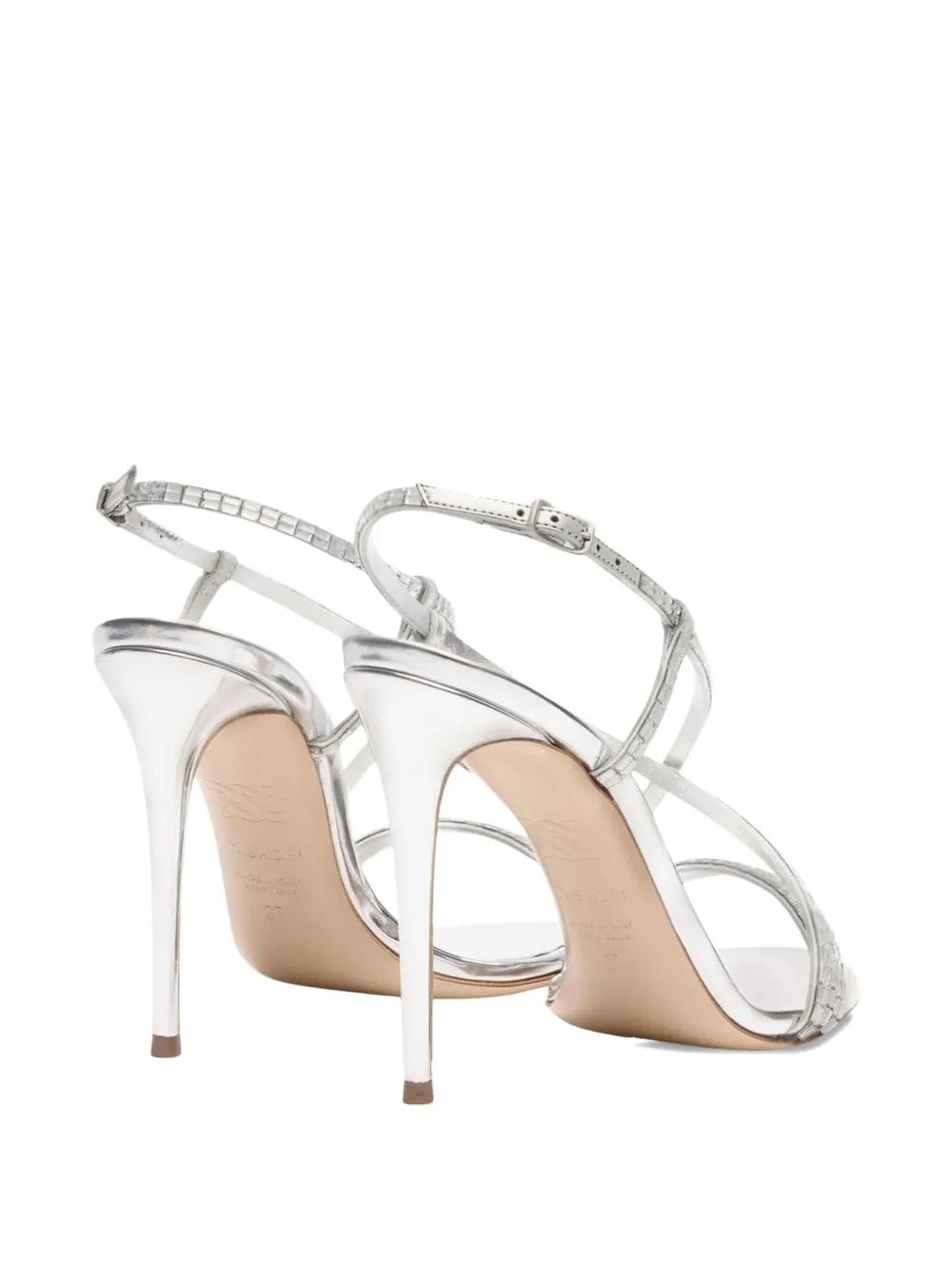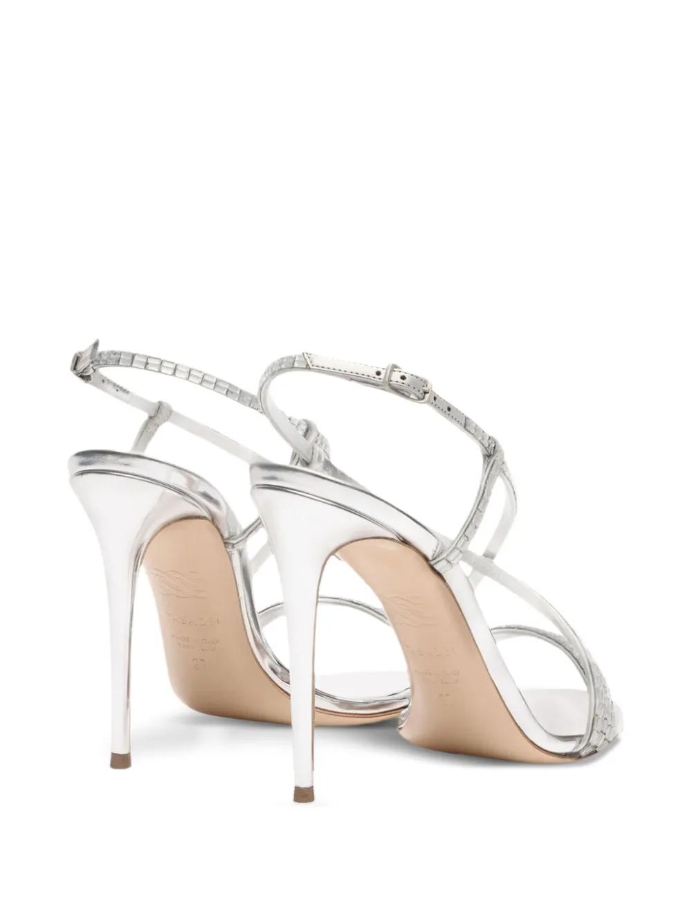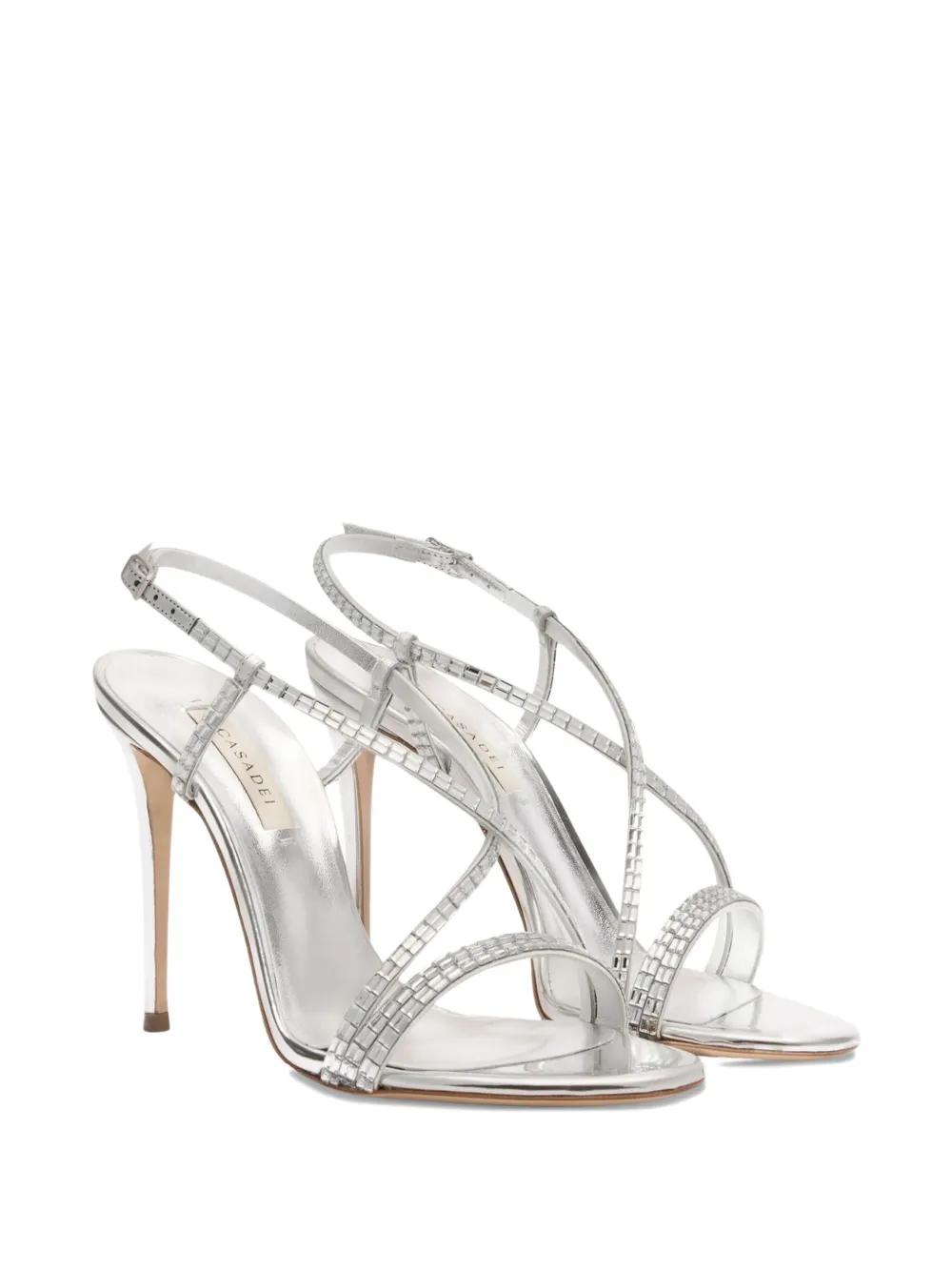 silver-tone stiletto heel slingback design ankle buckle fastening criss-cross straps crystal embellishments