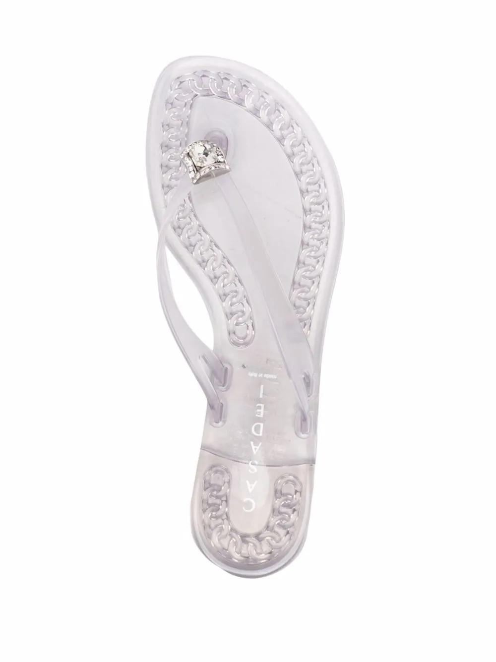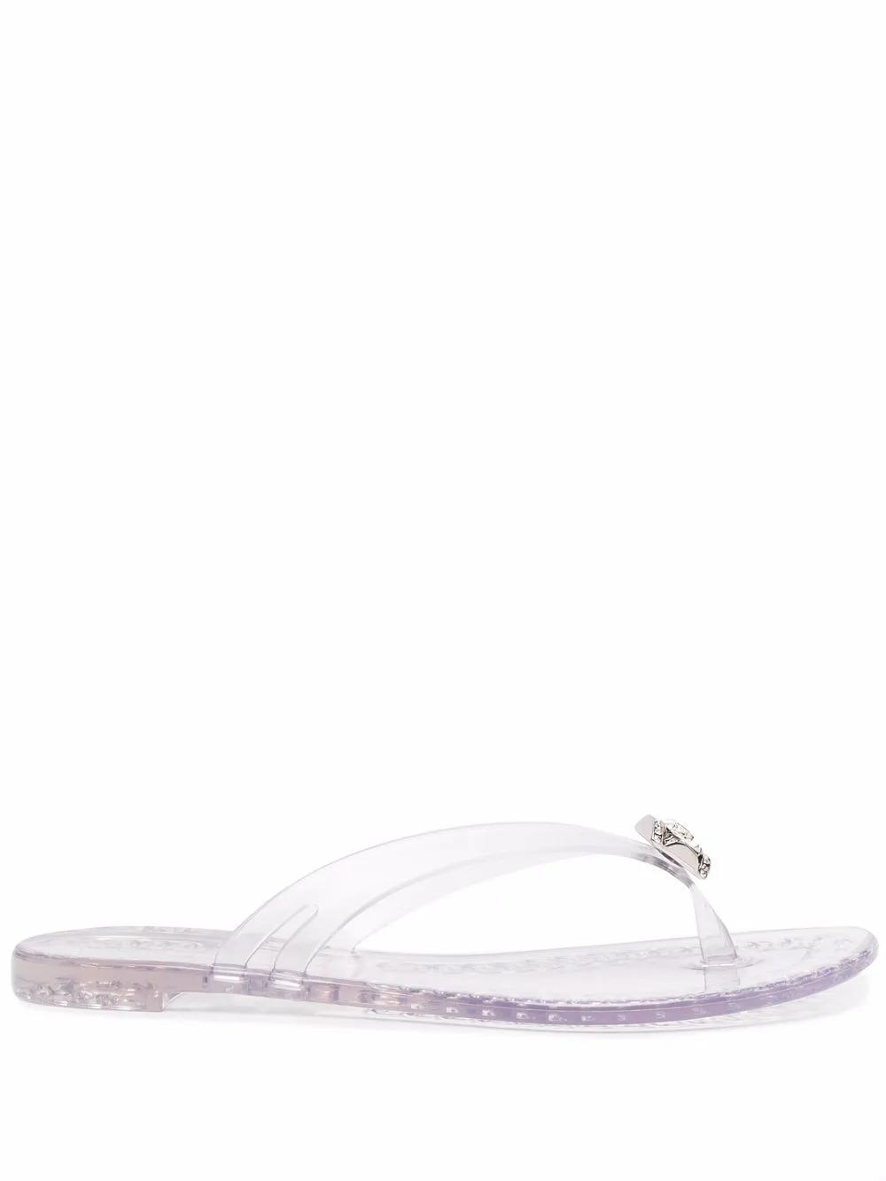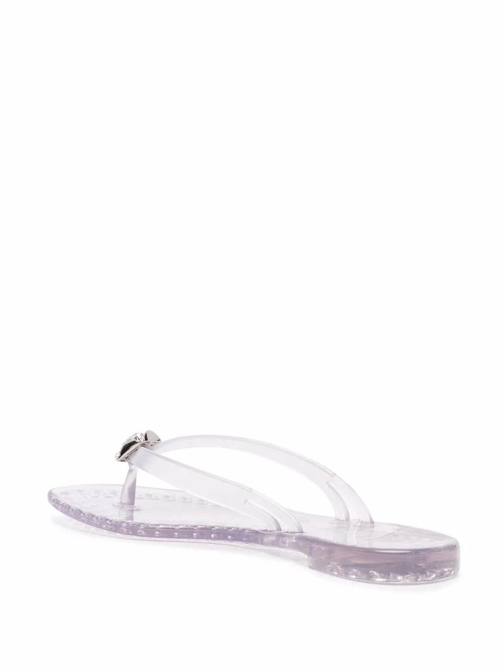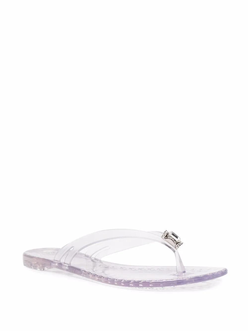 grey transparent design crystal embellishment open toe thong strap branded insole flat rubber sole