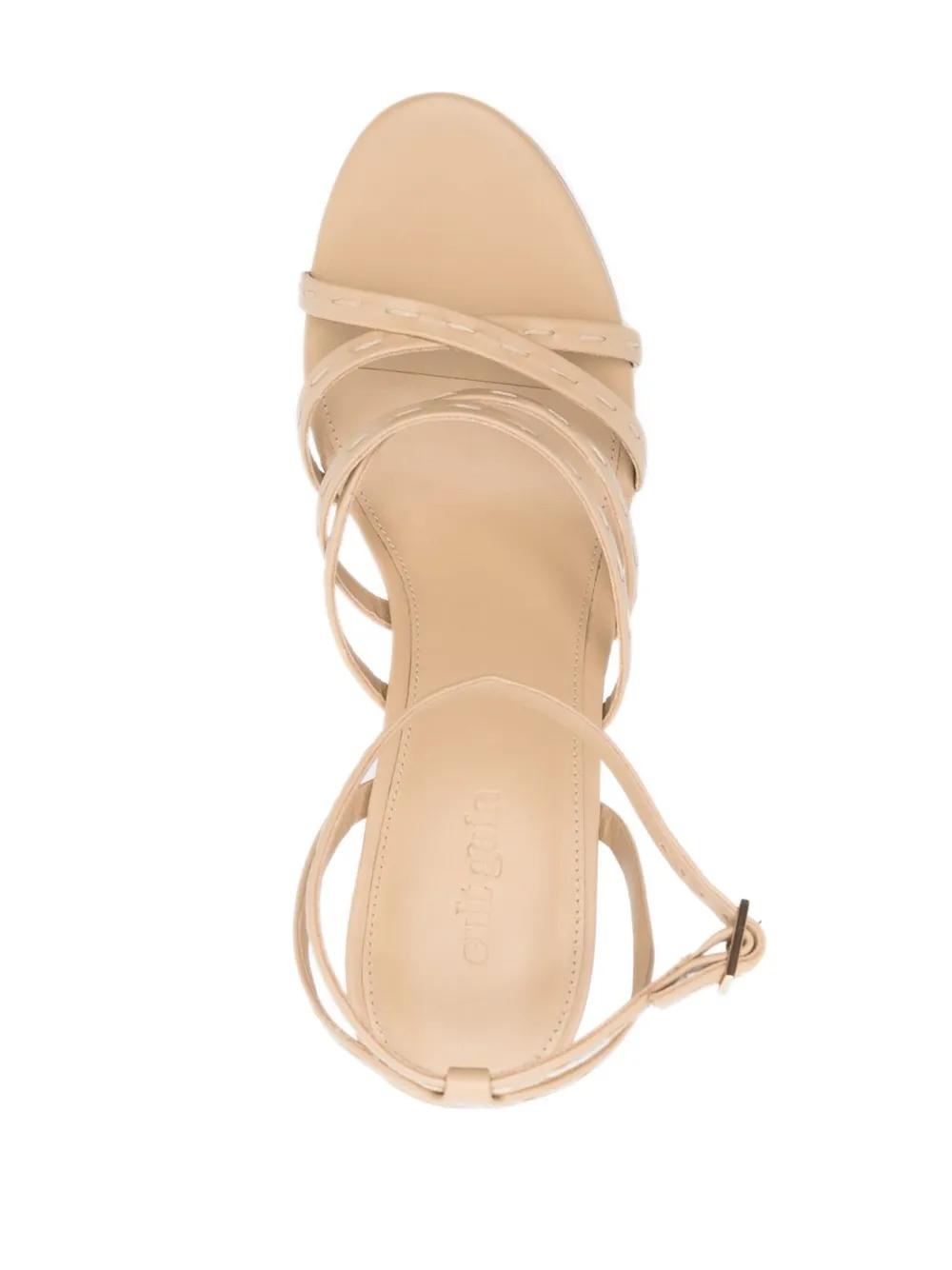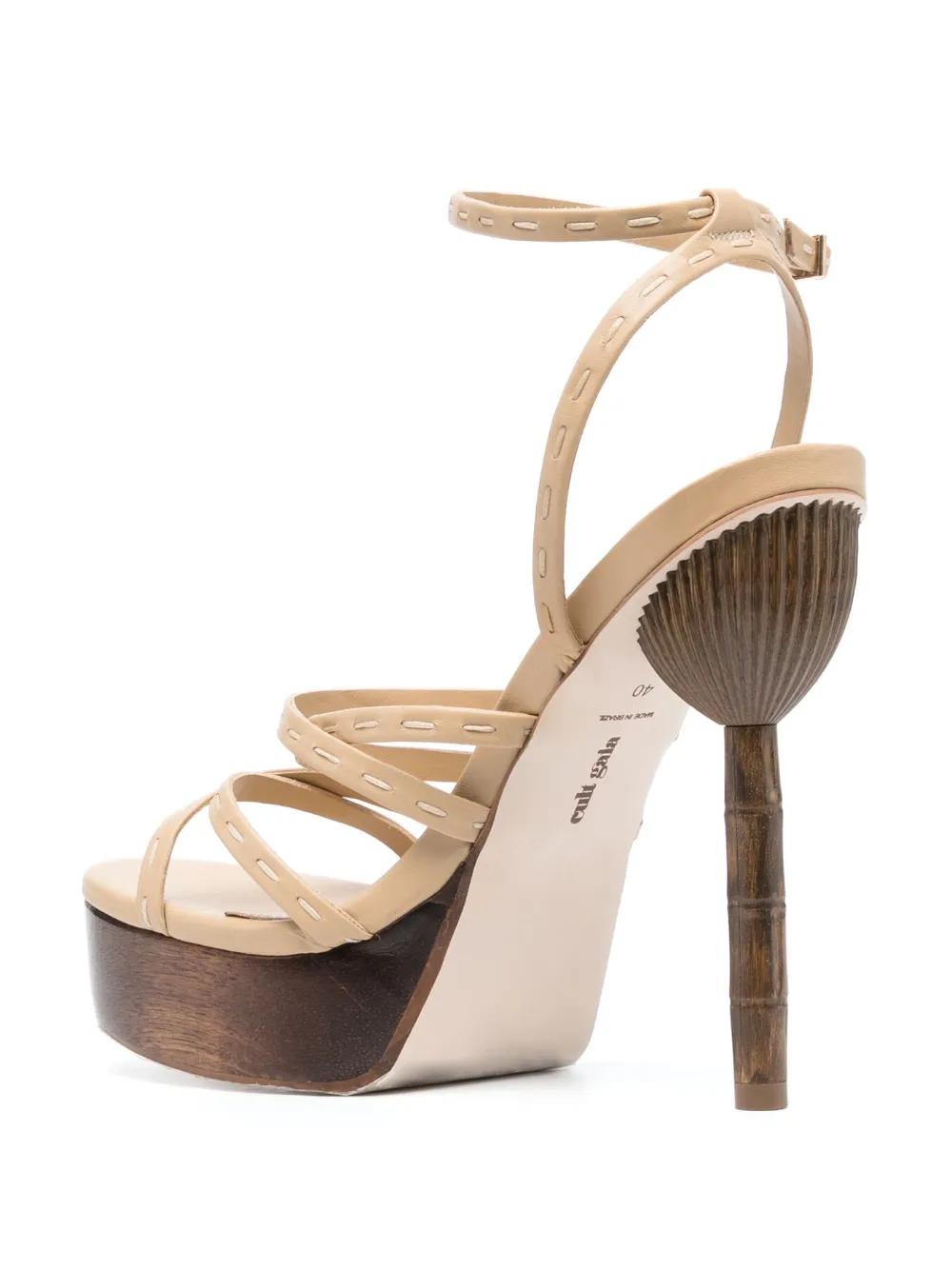 sand beige calf leather polished finish decorative stitching open toe buckle-fastening ankle strap multi-way straps branded leather insole 80mm sculpted heel platform sole