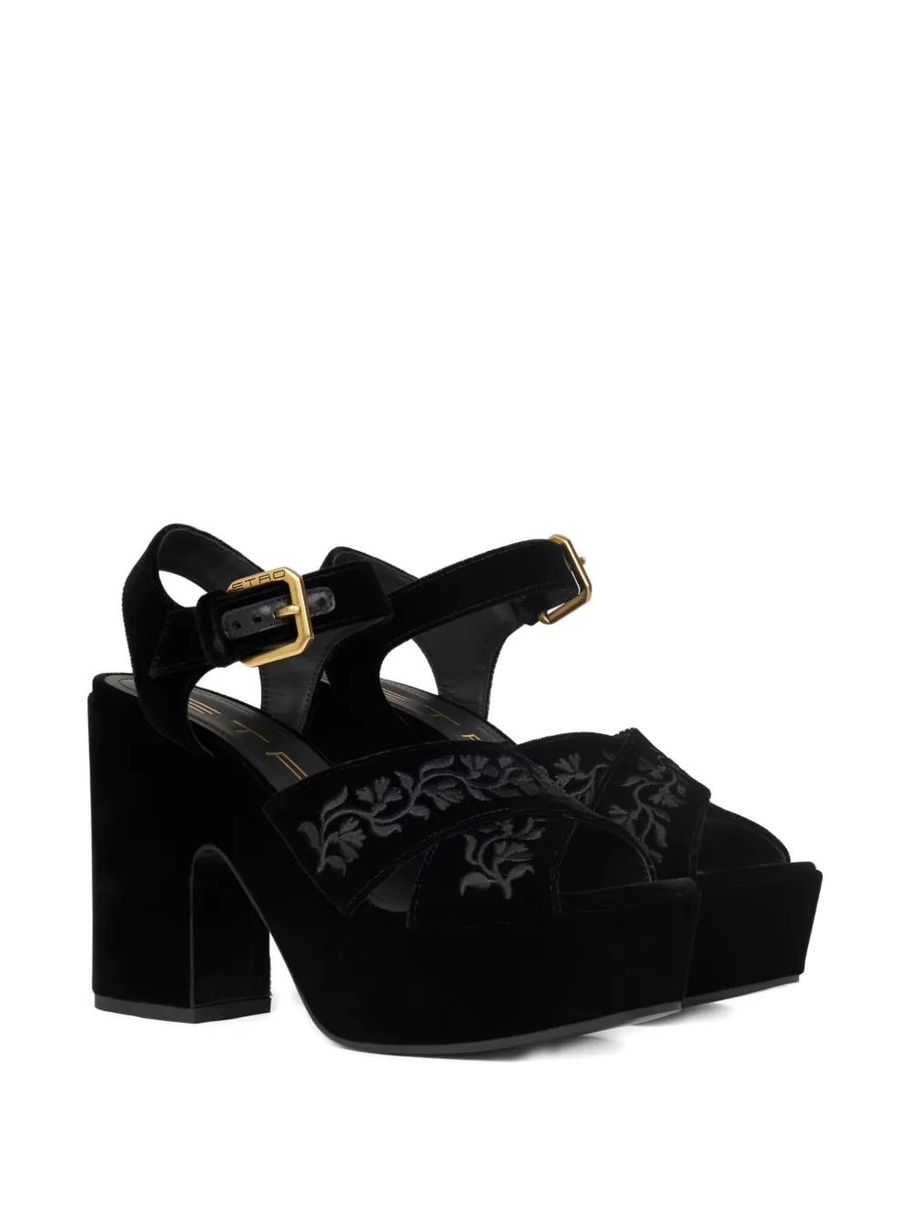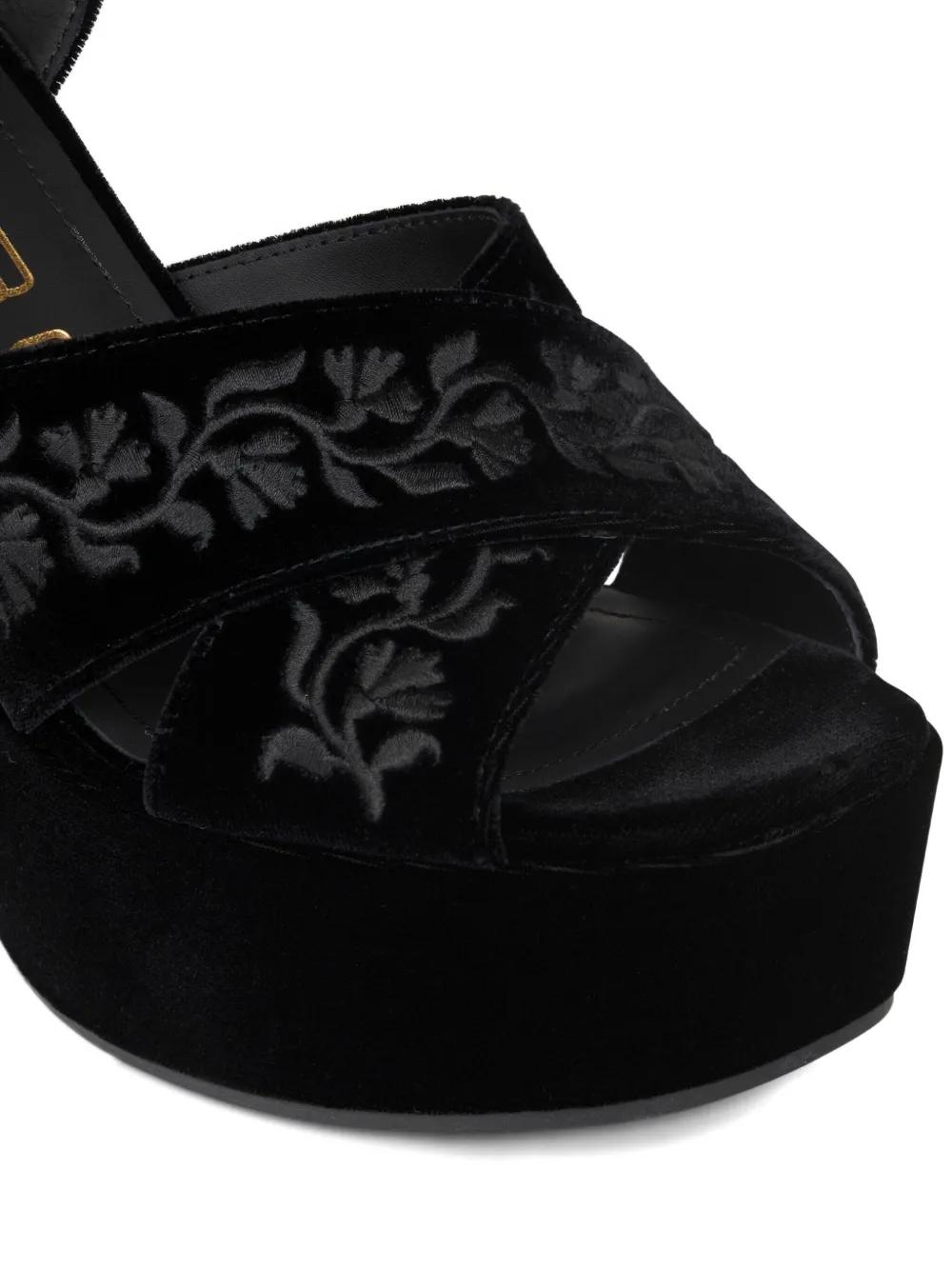 black velvet upper platform sole ankle strap buckle fastening floral embroidery