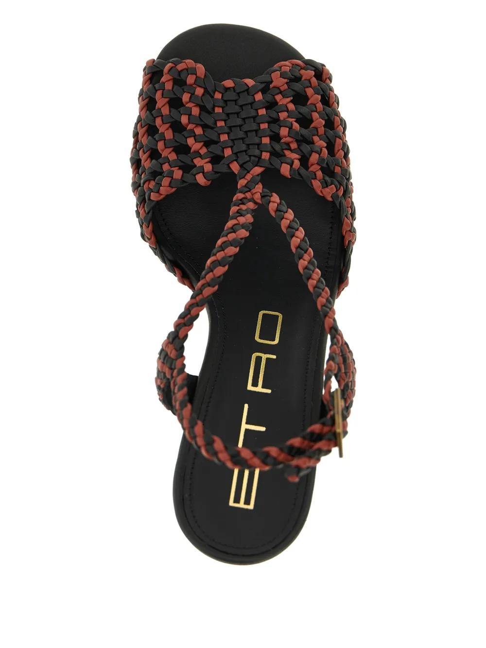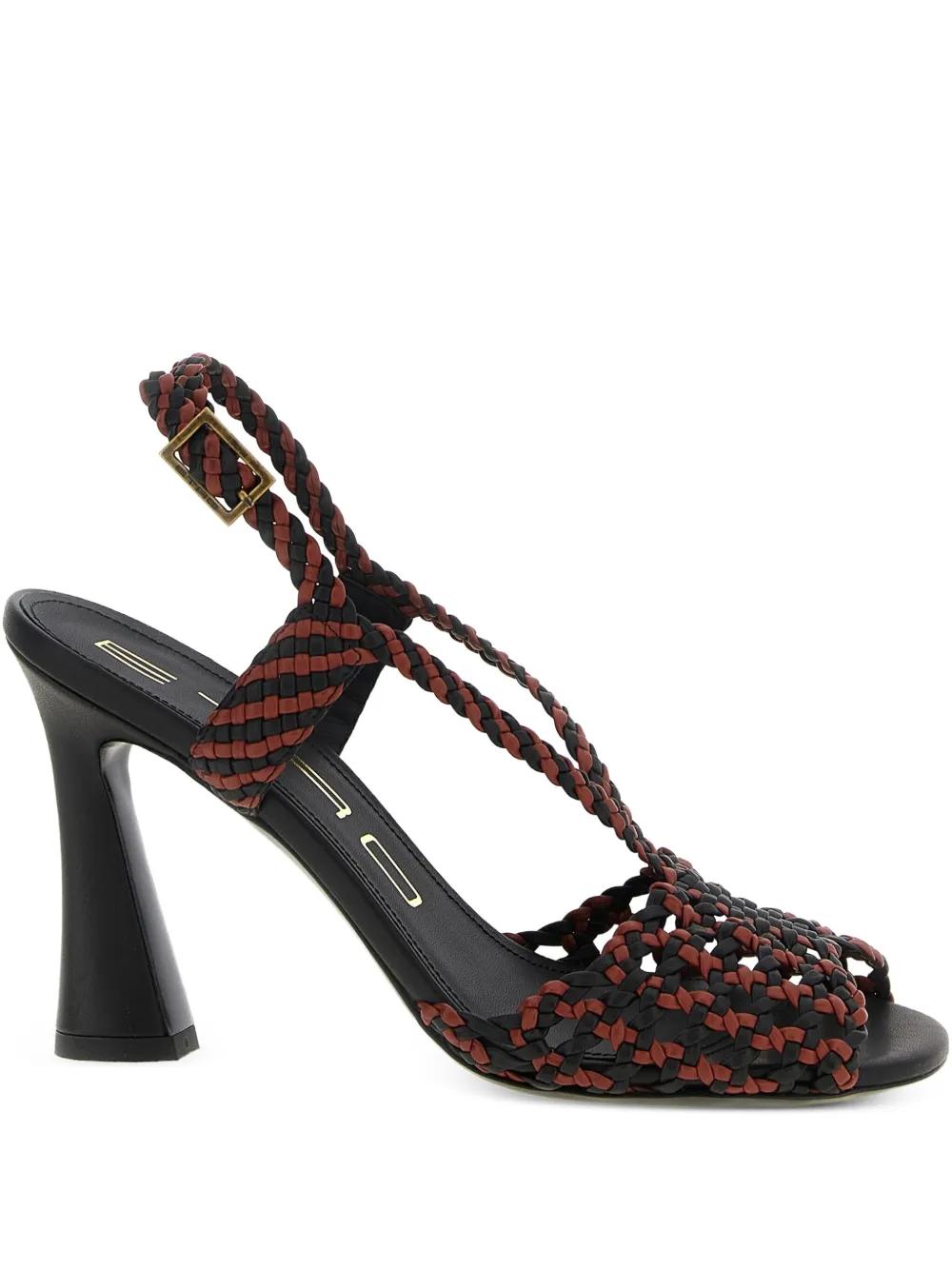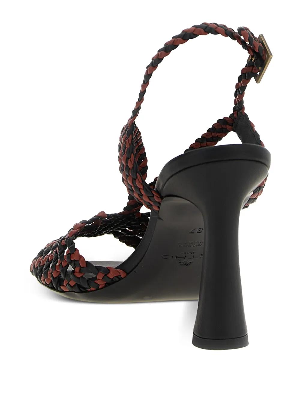 black and red braided leather ankle strap buckle fastening open toe sculpted heel