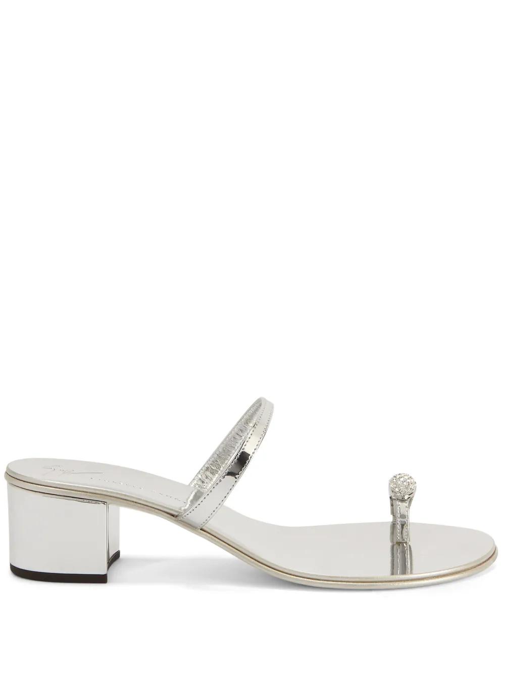 silver-tone slip-on style metallic finish single toe strap low block heel