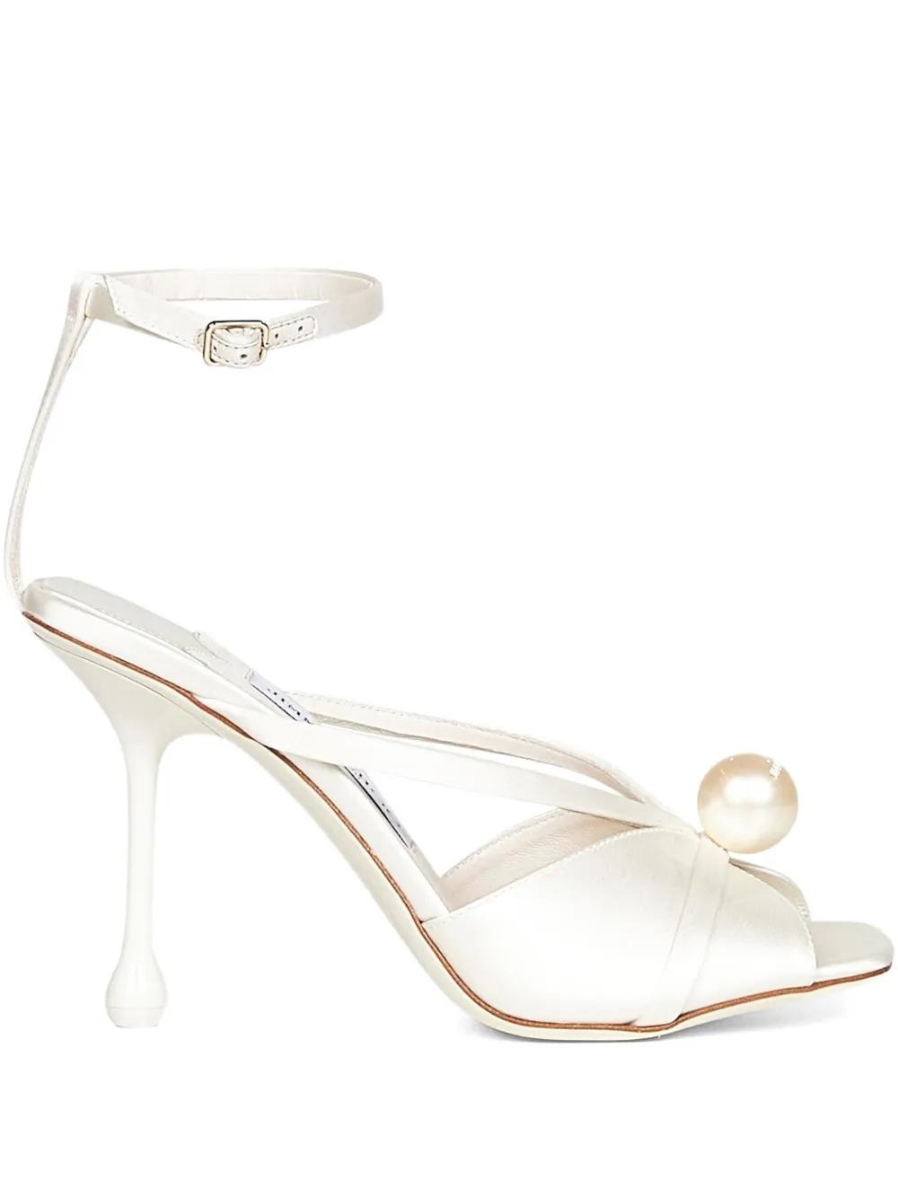 white satin upper ankle strap metal buckle sculptural drop heel pearl embellishment