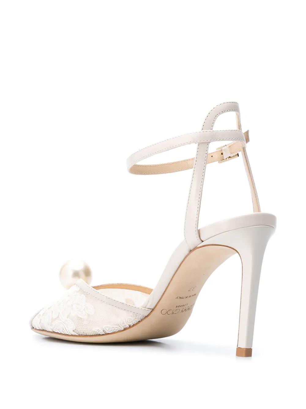 Ivory white lace and leather Sacora 85mm pearl-embellished sandals from Jimmy Choo featuring an open toe, a round toe, an ankle strap with a side buckle fastening, a branded insole and a pearl embellishment.