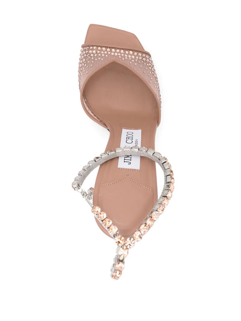 blush pink calf leather square open toe single crystal-embellished mesh toe strap branded footbed 100mm high stiletto heel leather sole crystal-embellished ankle strap