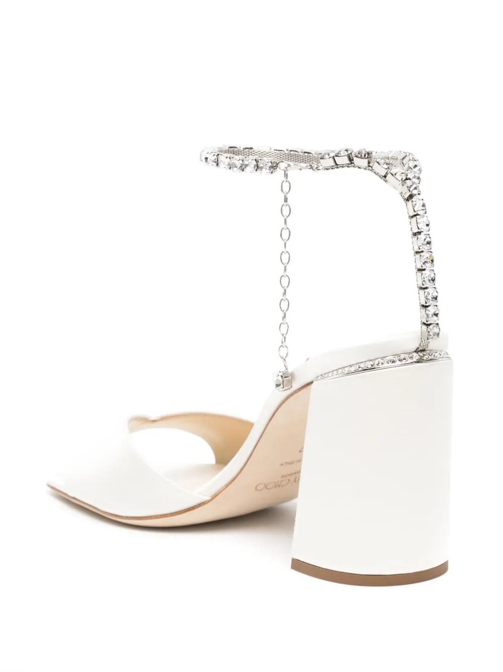 ivory white calf leather satin finish high block heel crystal-embellished ankle strap chain-link detailing hook fastening branded footbed square open toe rubber sole logo at the sole