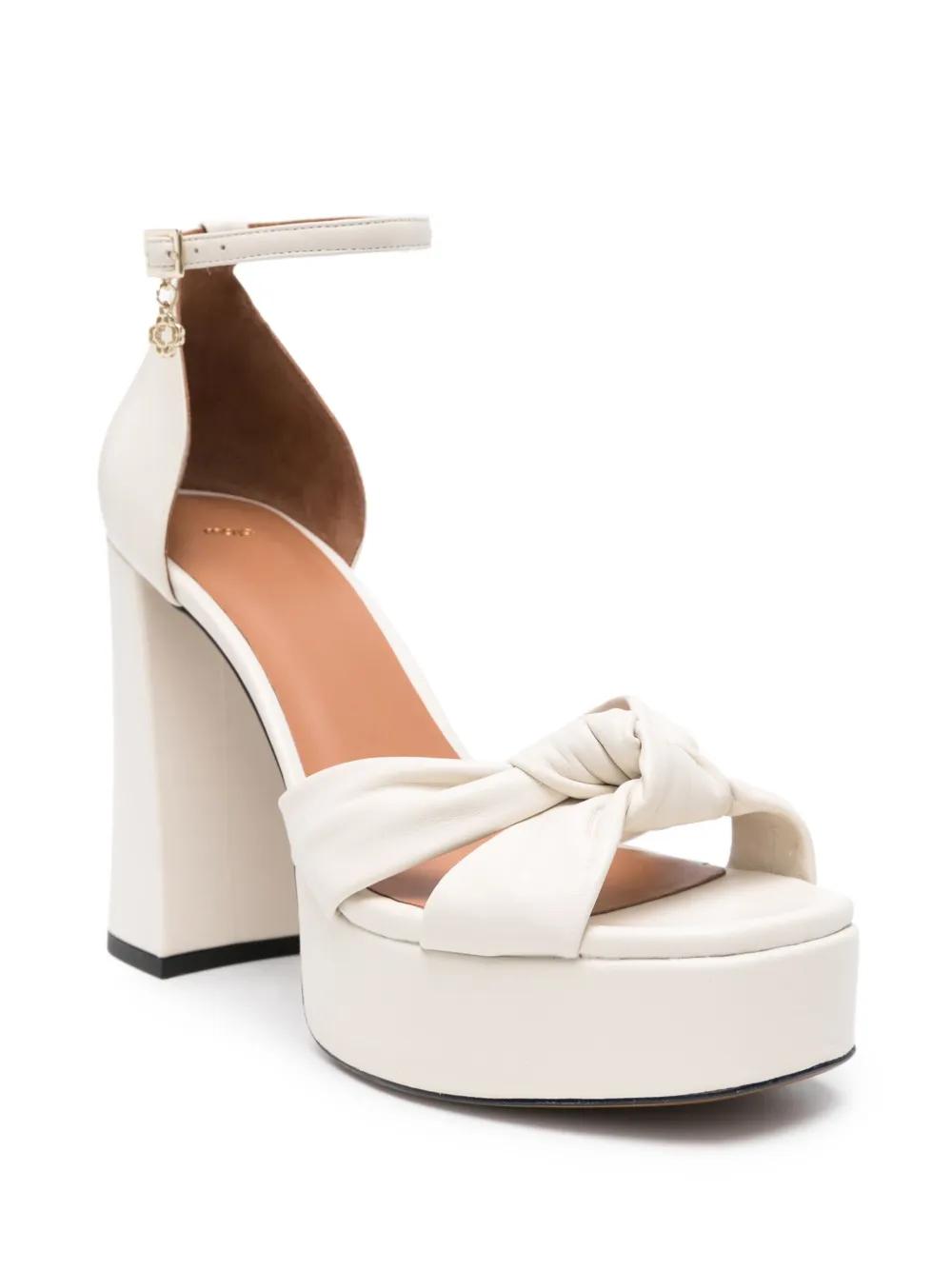 ecru calf leather high block heel signature Lucky Four Leaf Clover charm knot detailing square open toe platform sole gold-tone hardware buckle-fastening ankle strap