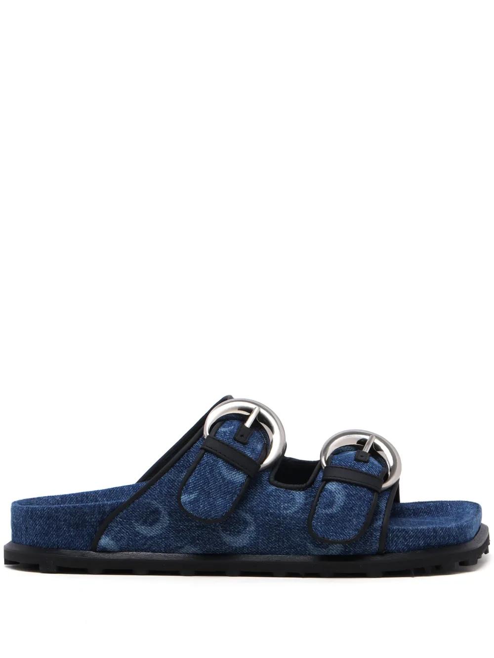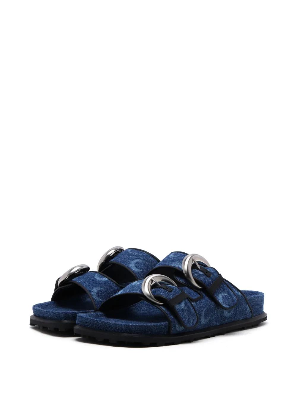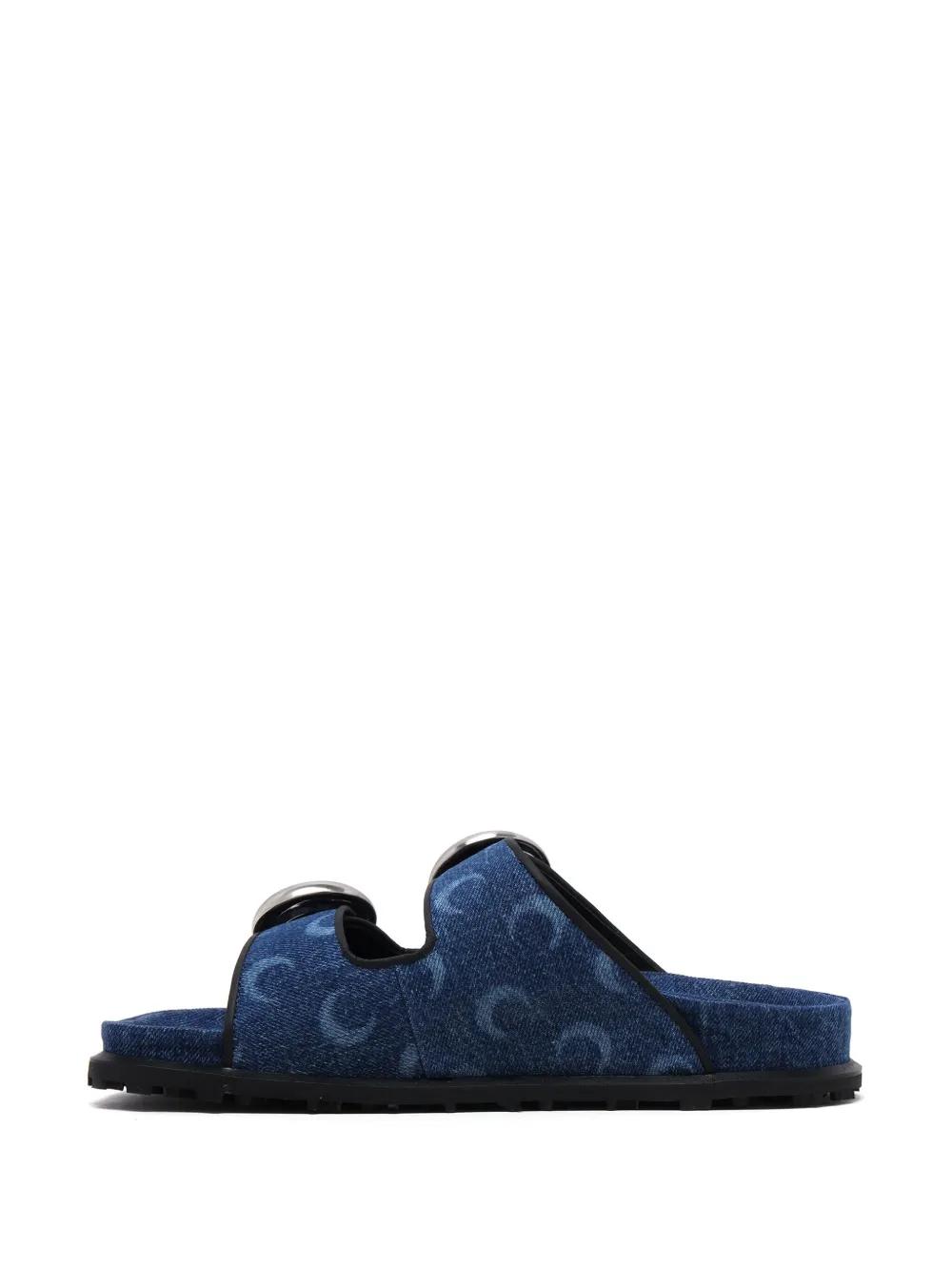 blue cotton crescent moon print open toe side buckle fastening branded insole rubber sole slip-on style