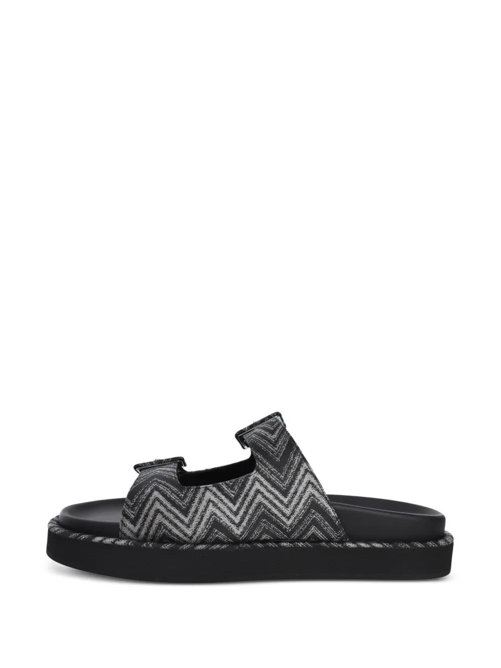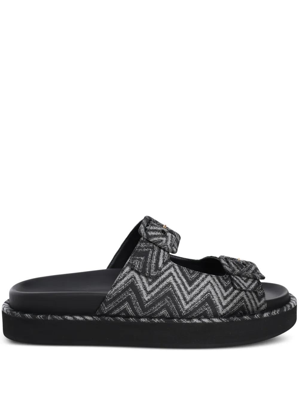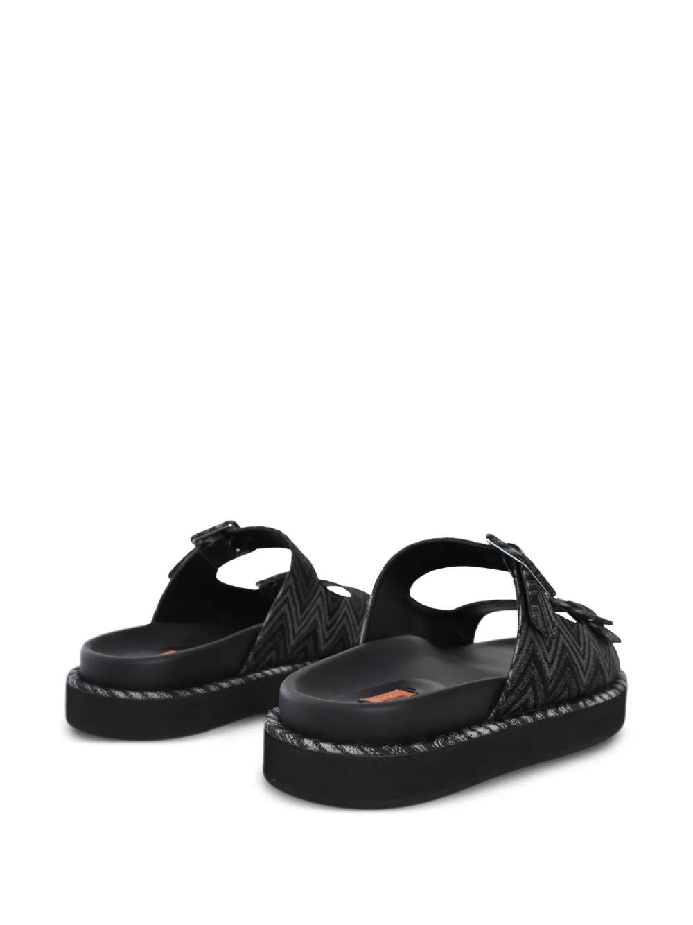 black canvas/leather double buckle fastening signature zigzag woven design round open toe branded insole moulded footbed flat rubber sole