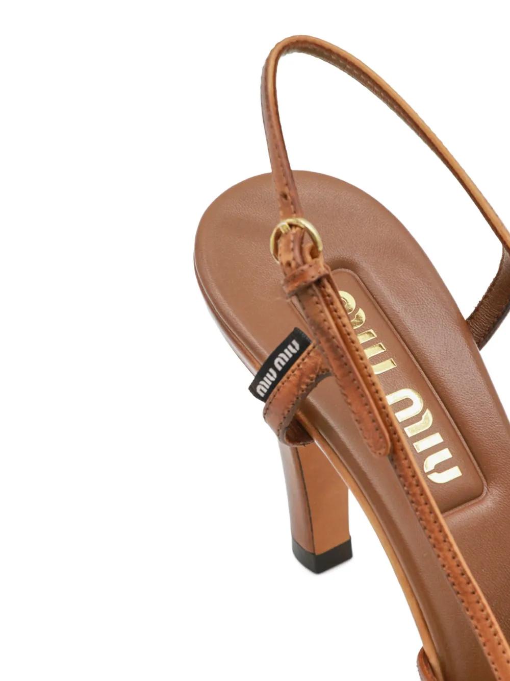 brown leather sole stiletto heel slingback strap buckle fastening logo label