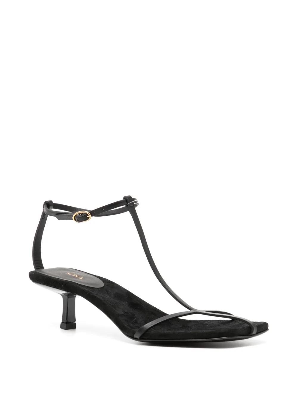 black calf leather T-bar strap open toe buckle-fastening ankle strap branded insole low stacked heel gold-tone hardware