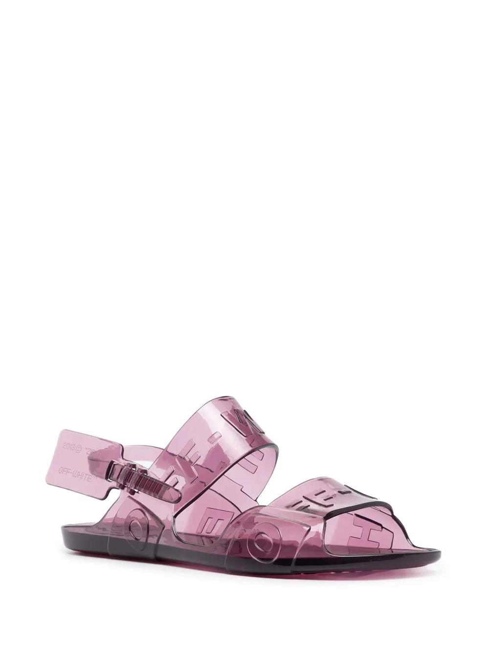 purple transparent design all-over debossed logo print signature Arrows motif slingback strap crossover strap detail open toe flat rubber sole