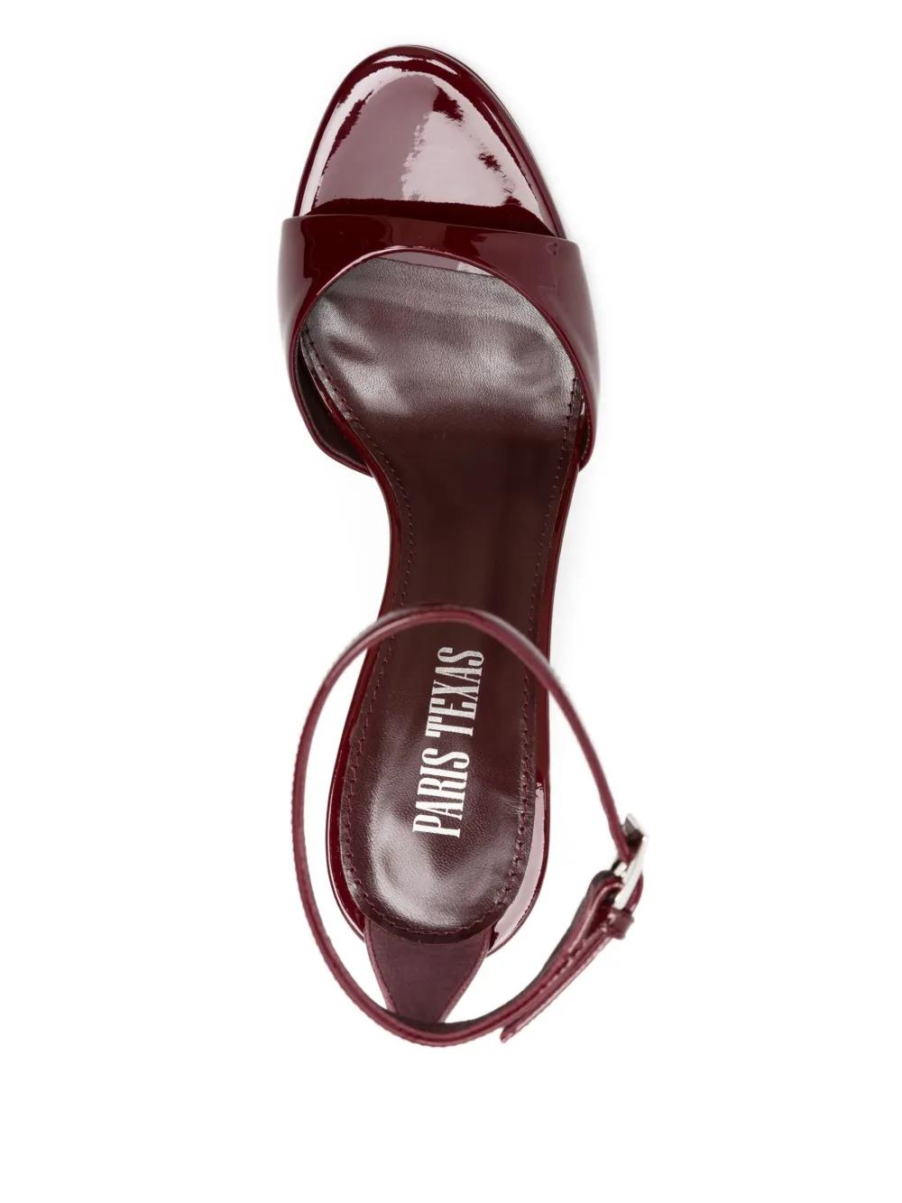 burgundy patent leather stiletto heel ankle strap buckle fastening open toe