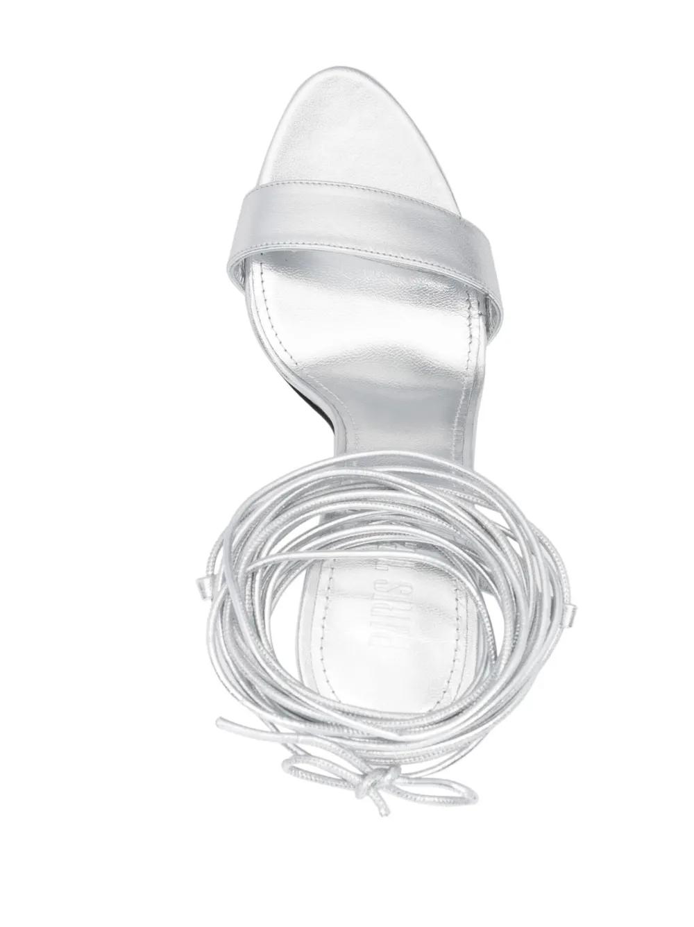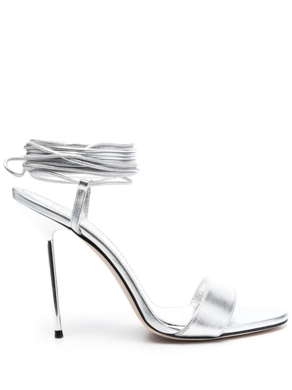 silver-tone calf leather metallic effect open toe tie-fastening ankle strap branded insole high 105mm stiletto heel