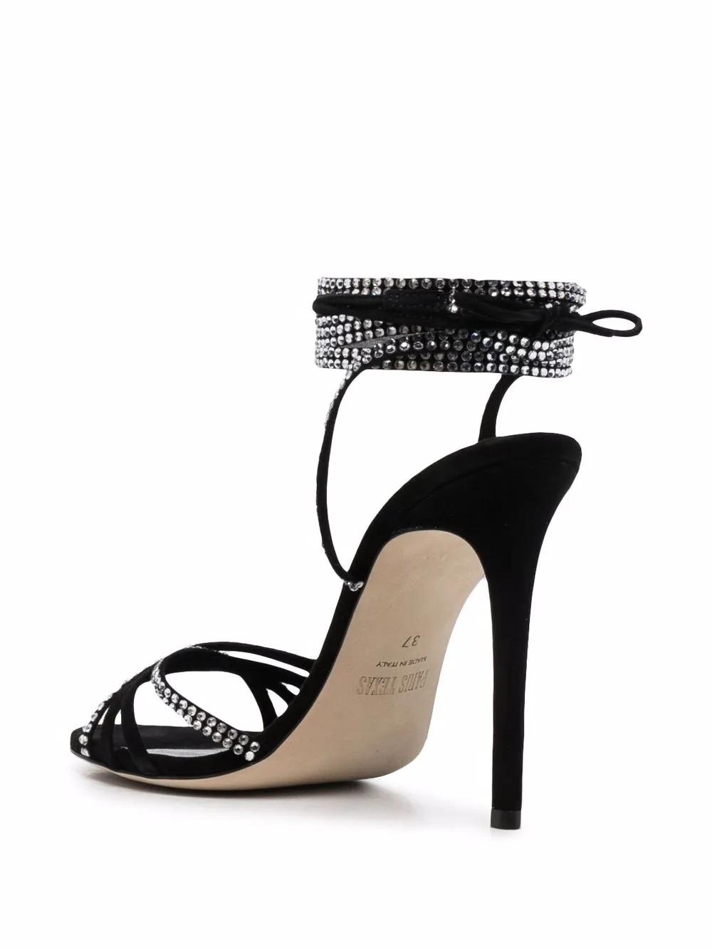 black leather crystal embellishment crossover strap detail tie-fastening ankle strap open toe branded footbed 110mm stiletto heel
