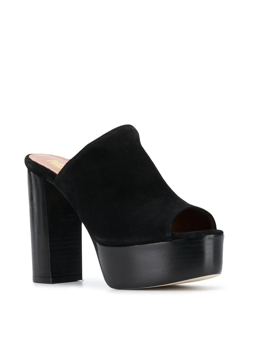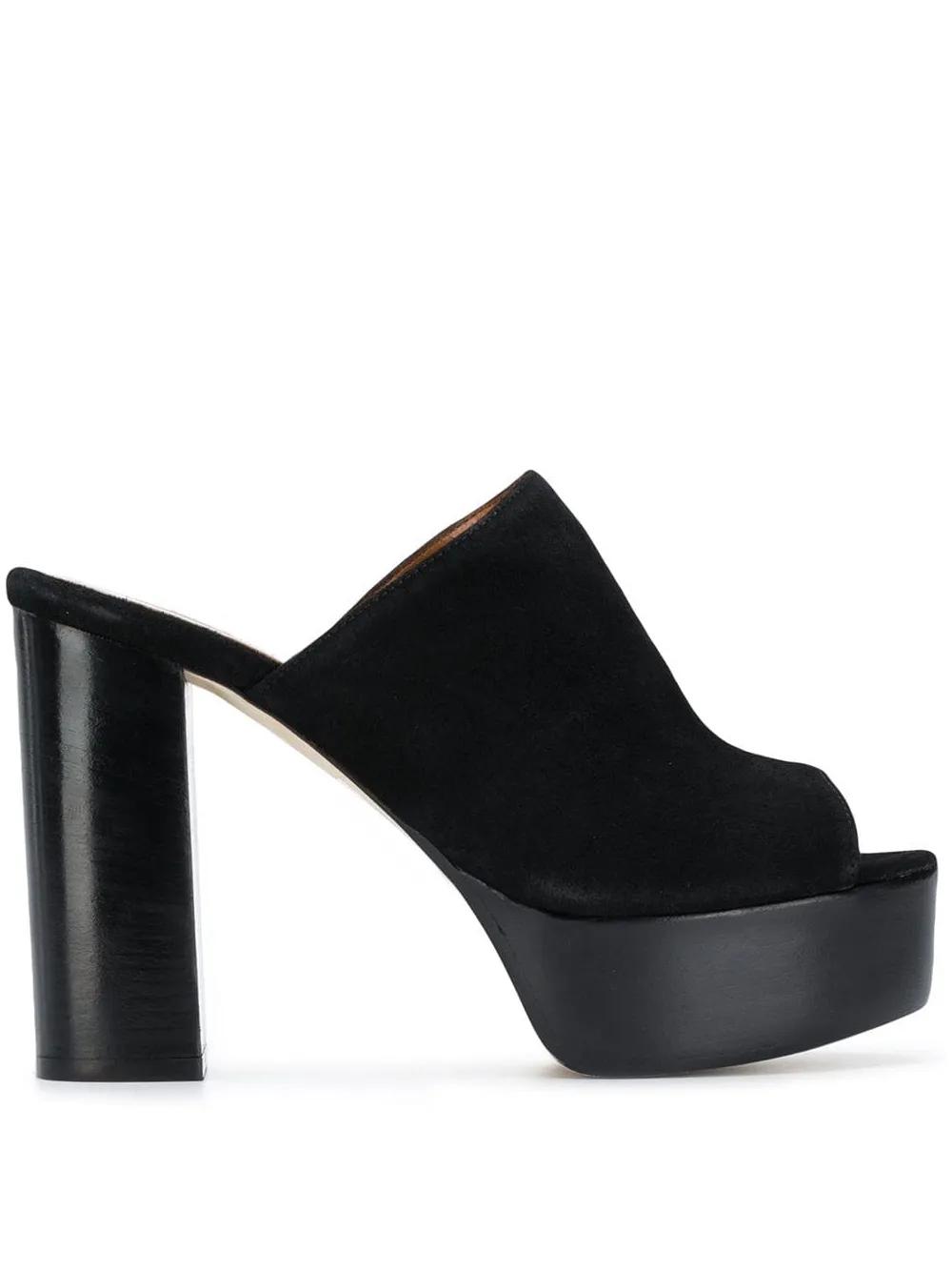 Black leather platform sandals from paris texas featuring a high block heel, a branded insole and a slip-on style.