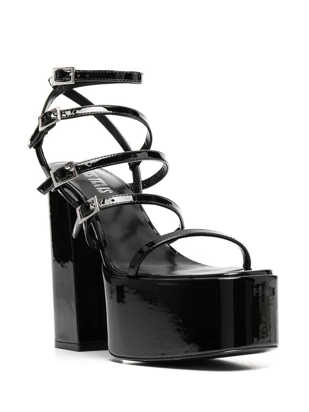 black patent leather open toe side buckle fastening branded insole platform sole high block heel