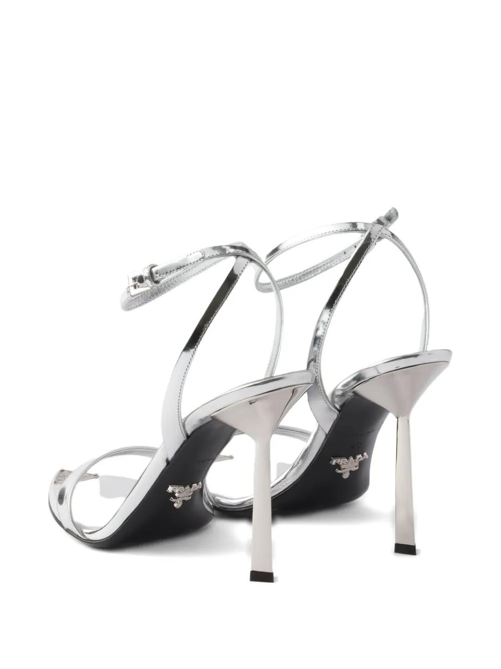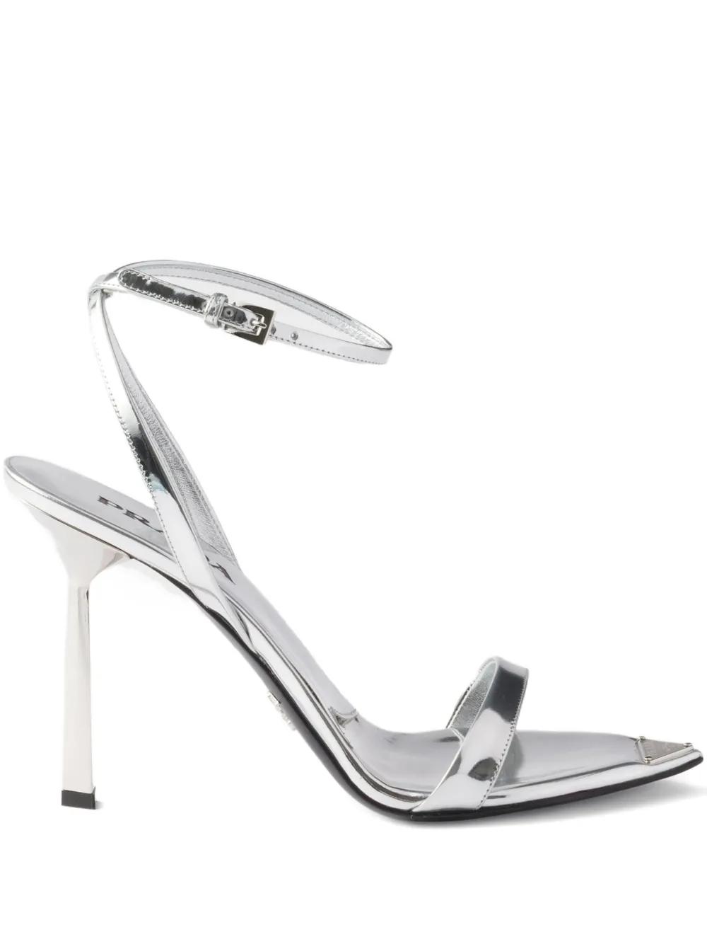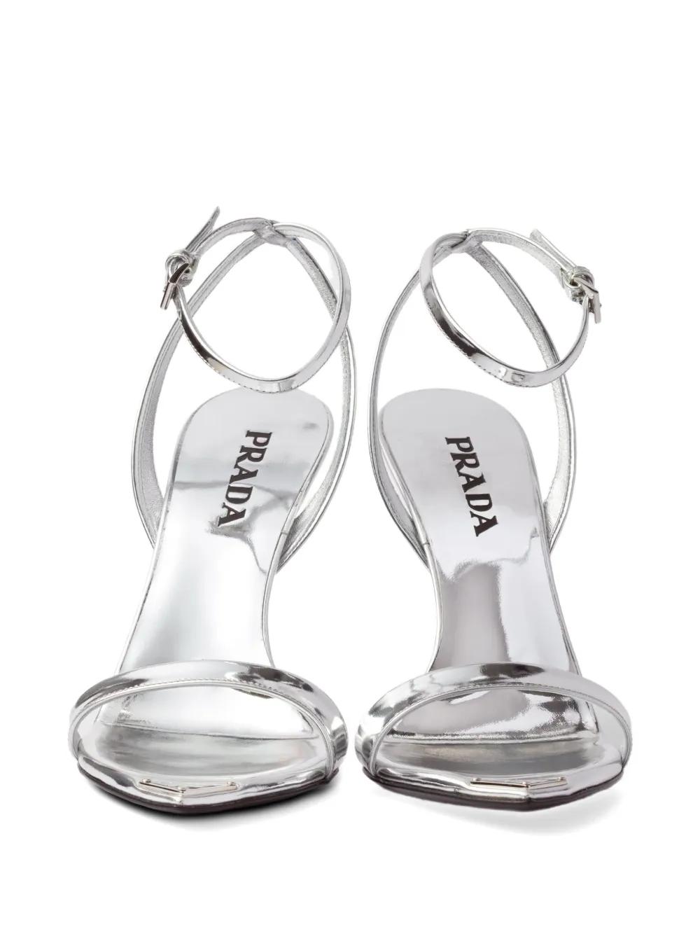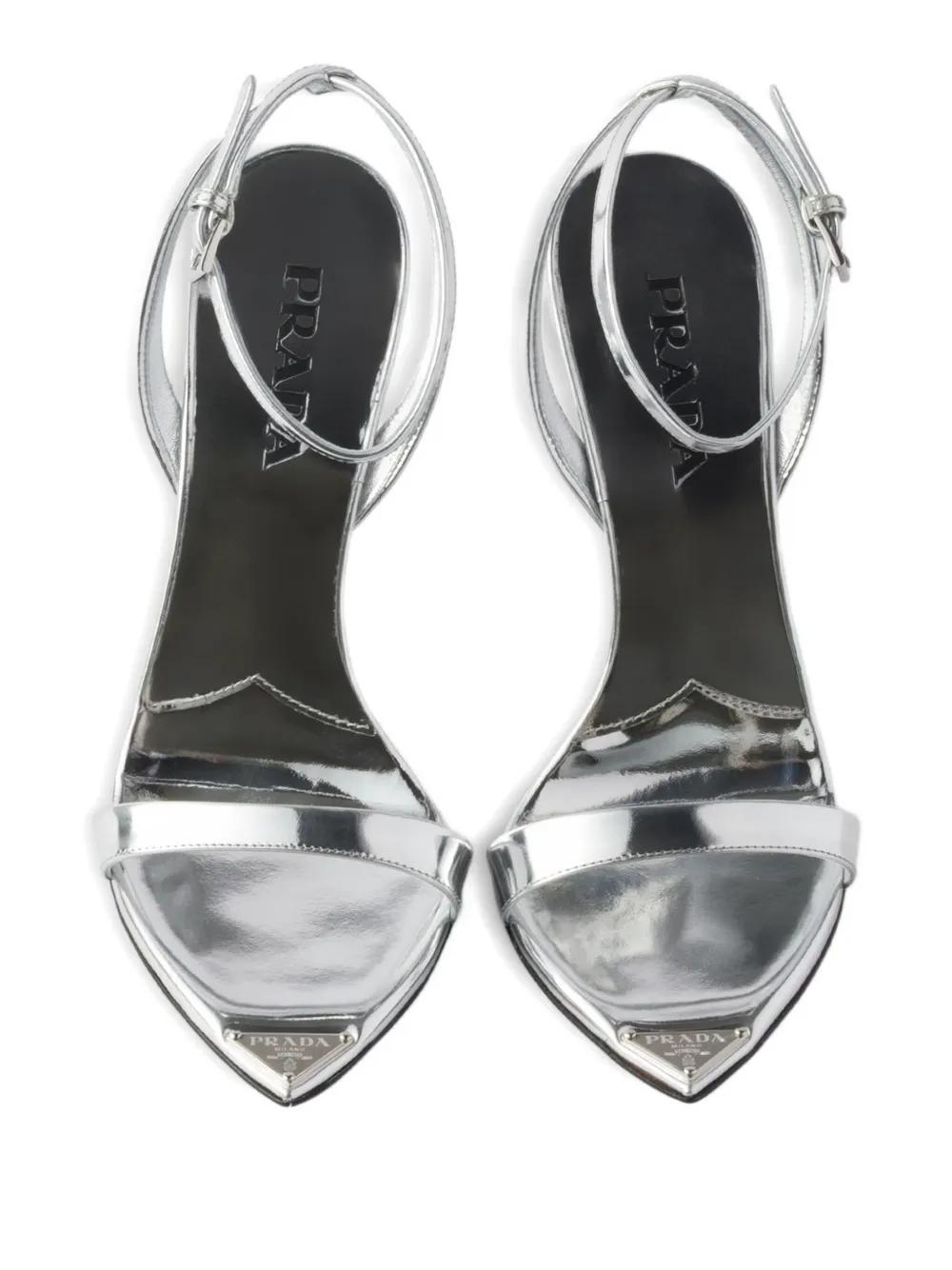 silver-tone metallic leather ankle strap buckle fastening stiletto heel triangle logo
