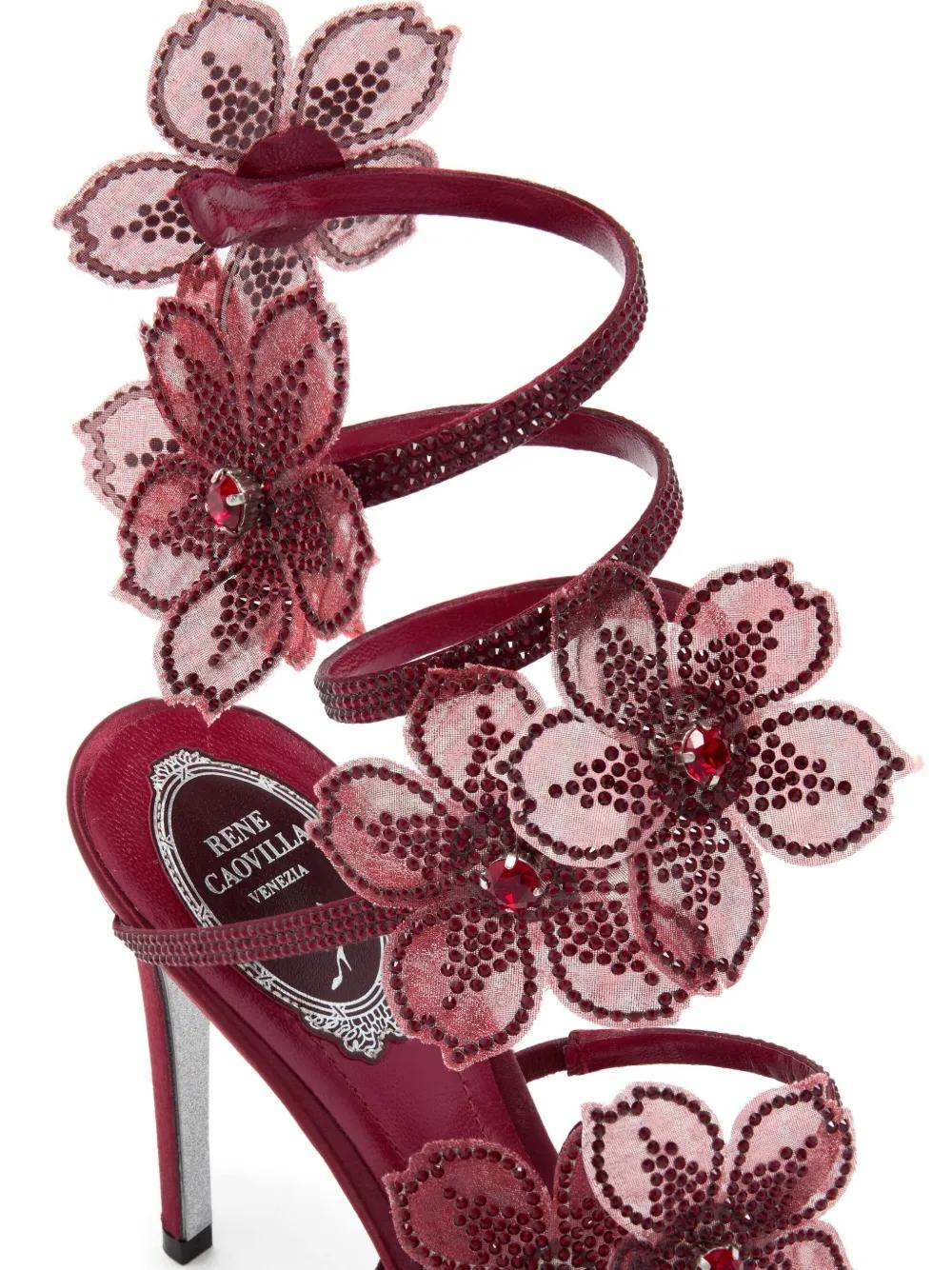 red spiral ankle wrap embellished flower appliqués high heel open toe