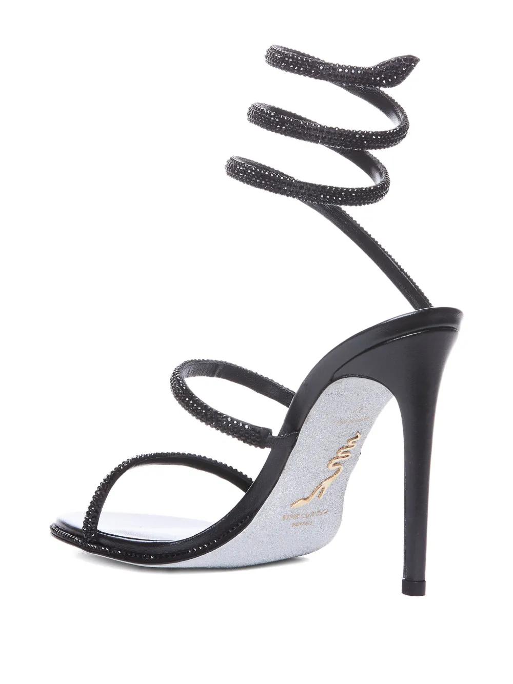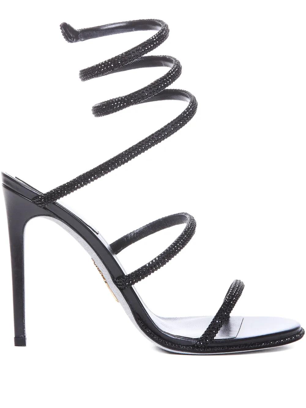 black slip-on style high stiletto heel round open toe rhinestone embellishment