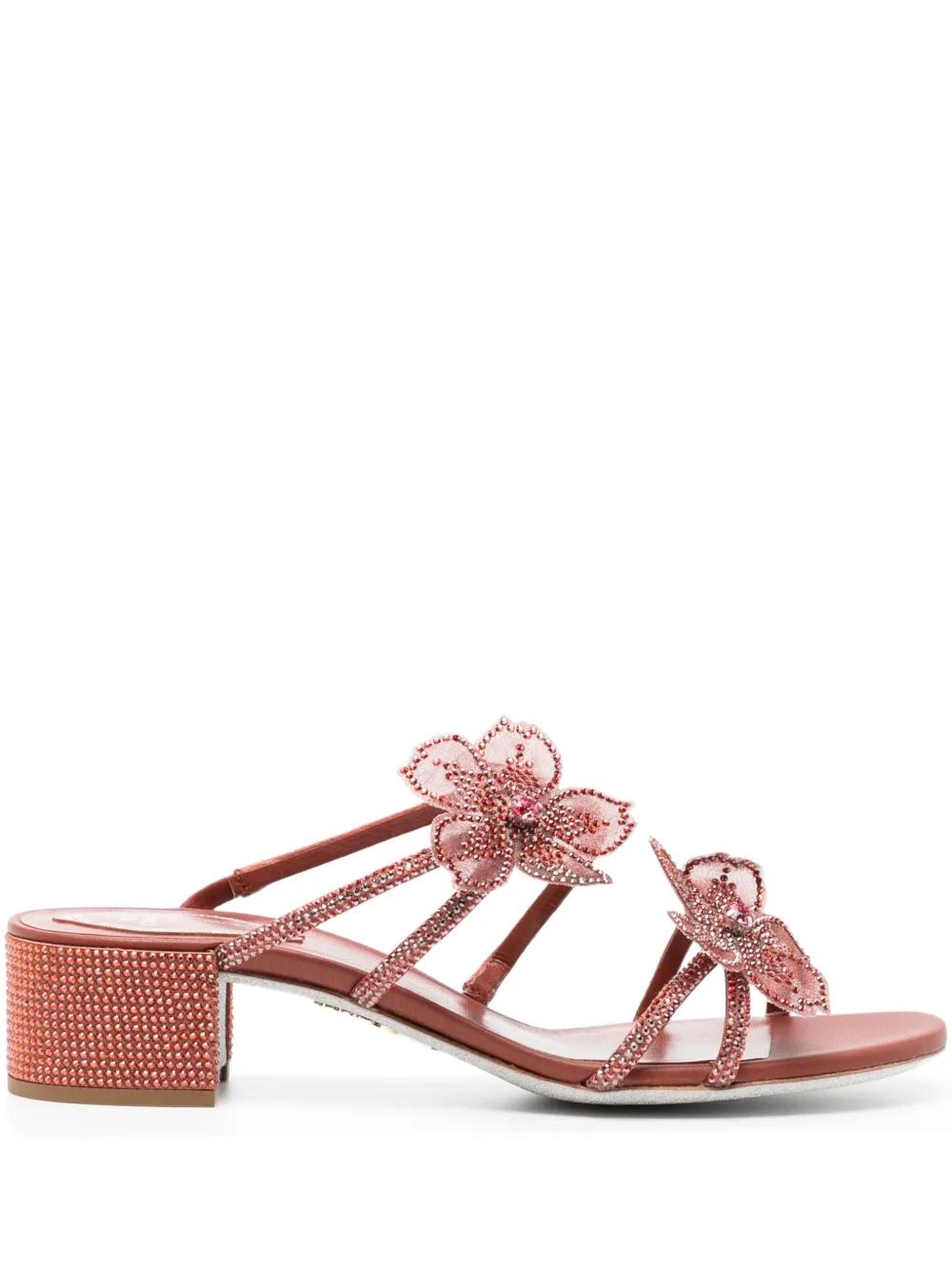 chestnut brown slip-on style block heel floral appliqué crystal embellishment