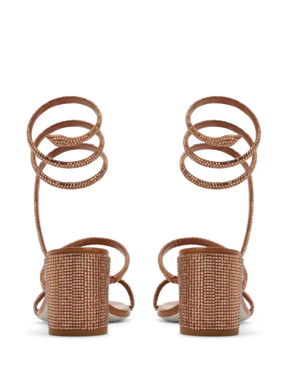 brown satin weave crystal embellishment caged design round open toe branded footbed mid block heel