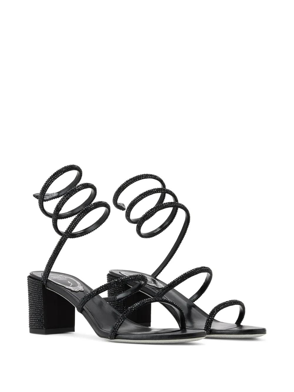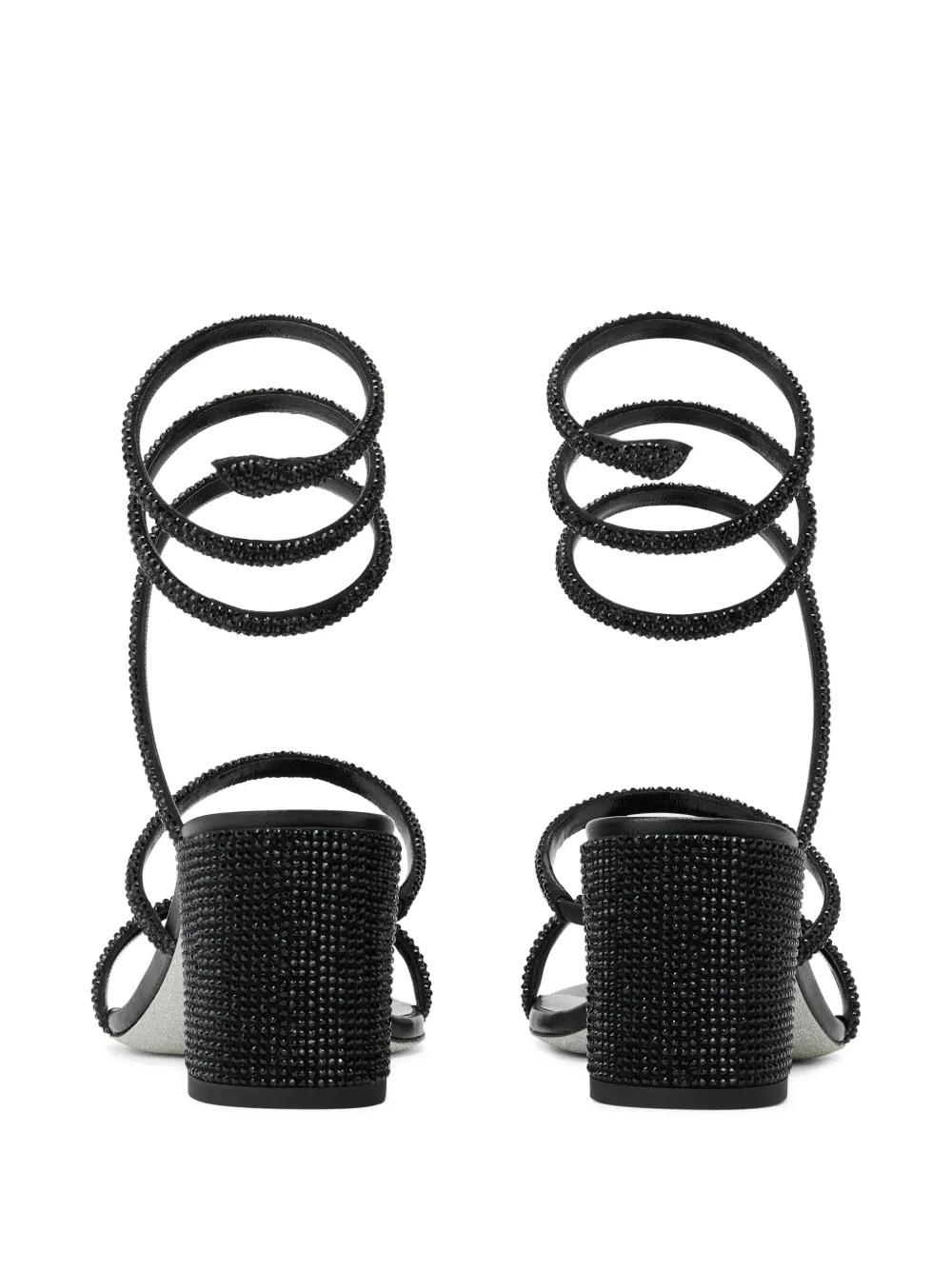 black satin finish rhinestone embellishment round open toe wraparound style branded leather insole high block heel