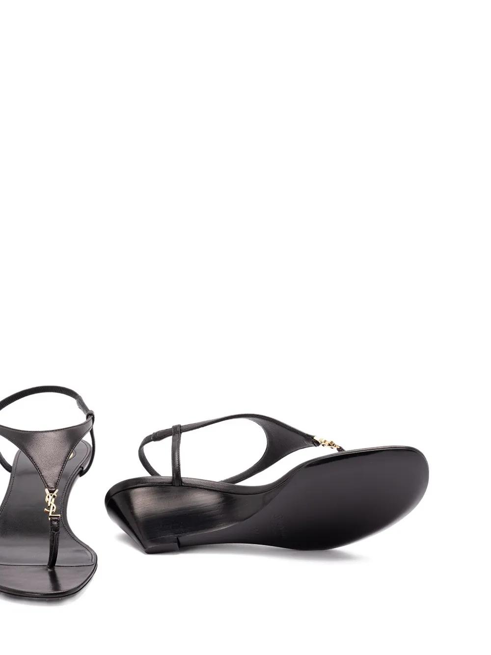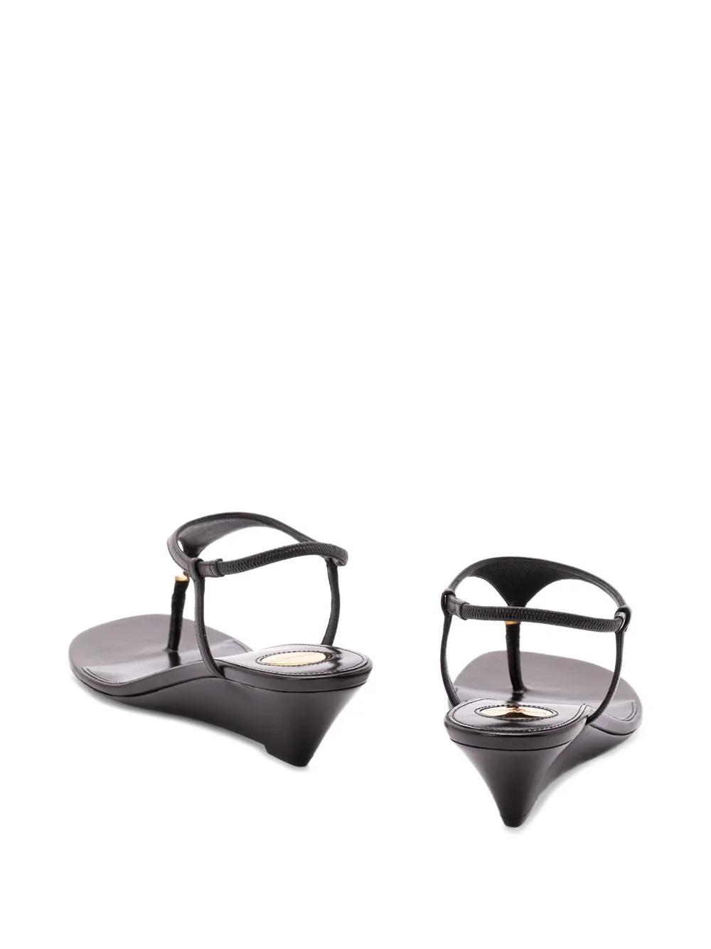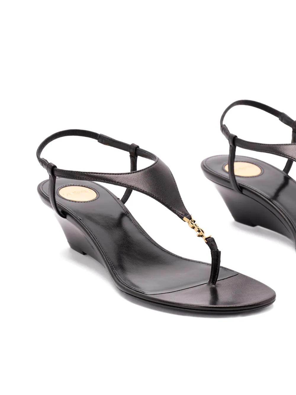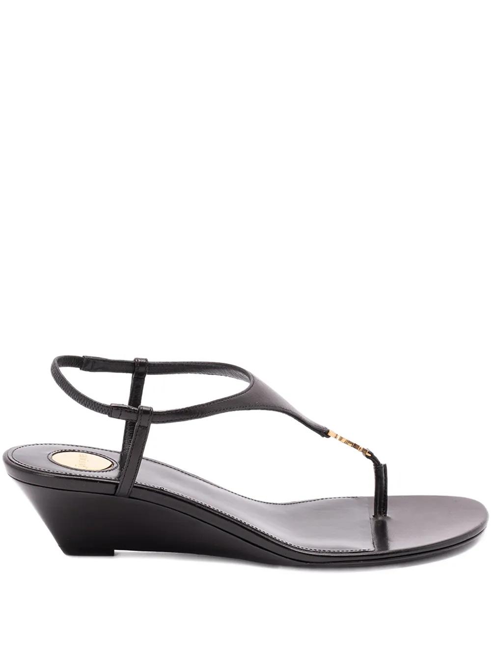 black elasticated slingback strap round open toe mid wedge heel gold-tone logo plaque