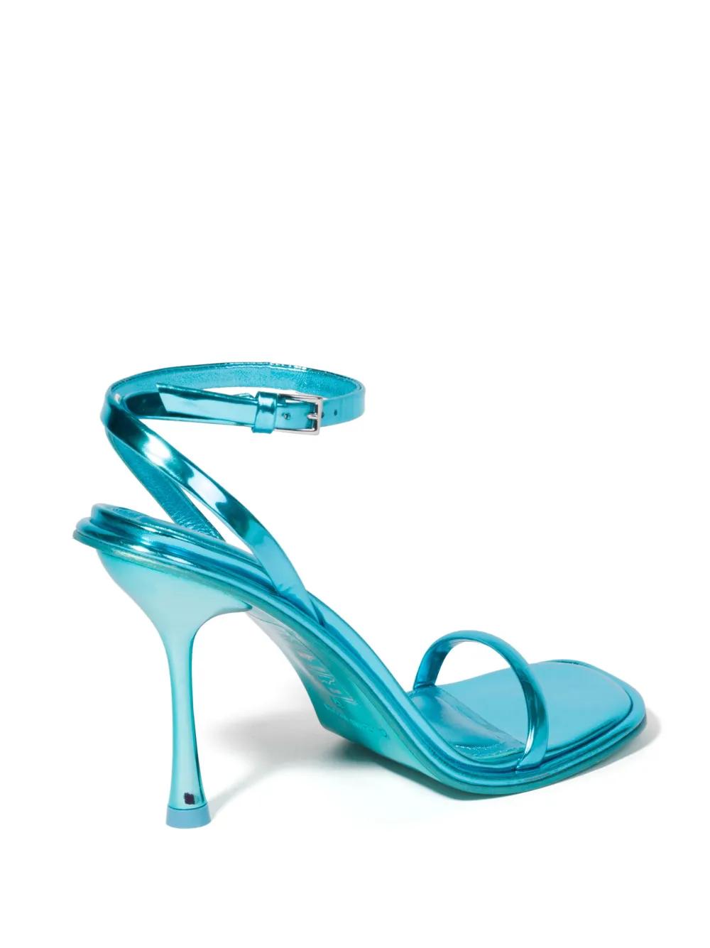 blue leather metallic effect thin straps open toe buckle-fastening ankle strap branded leather insole high stiletto heel
