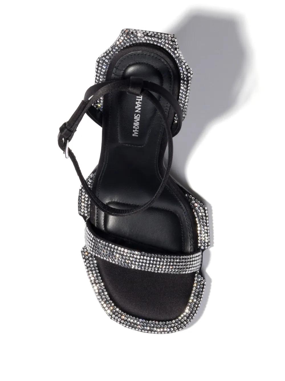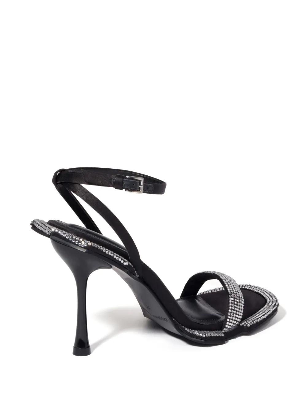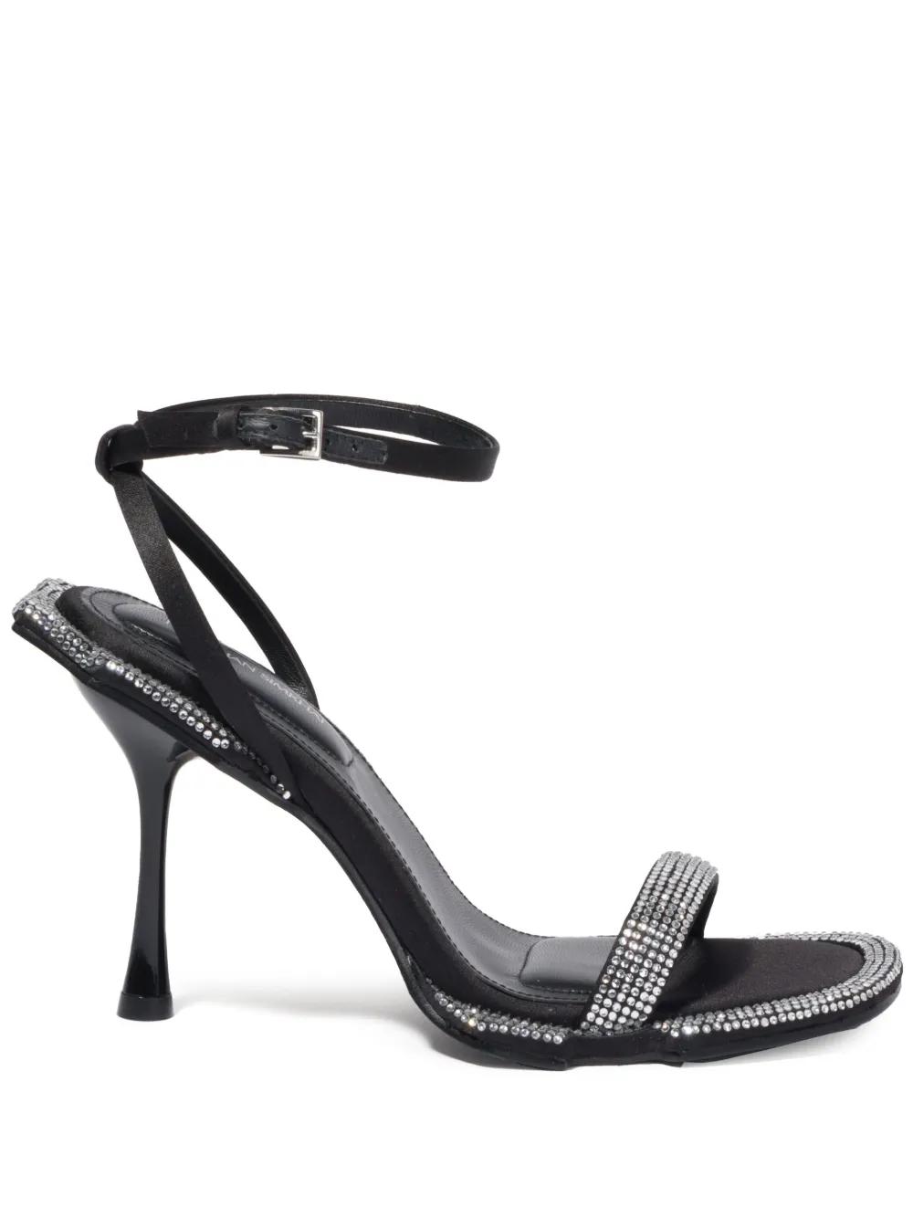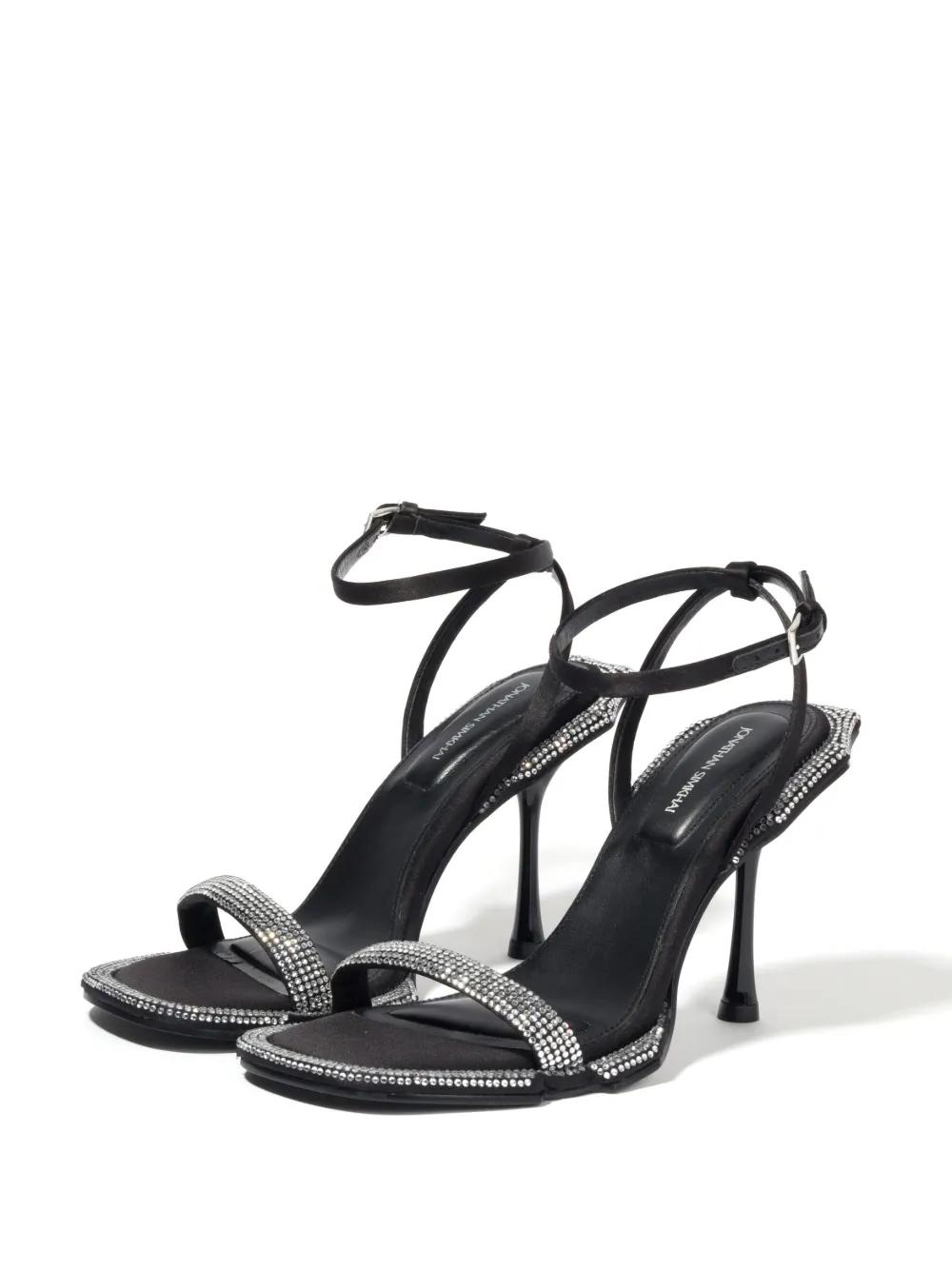 black leather crystal embellishment thin straps open toe buckle-fastening ankle strap branded leather insole high stiletto heel