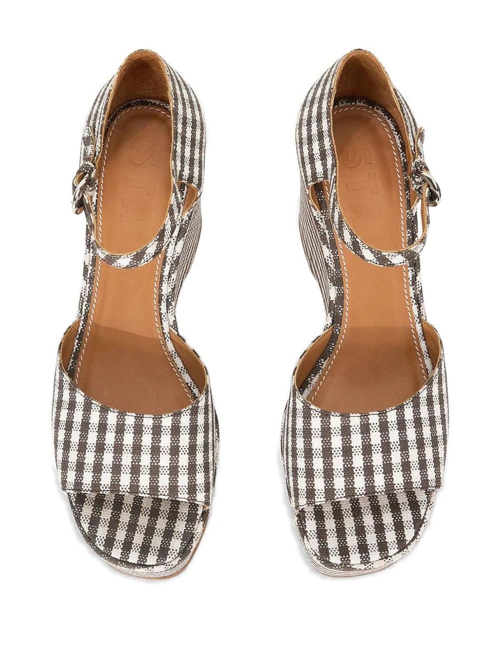 chocolate brown gingham check pattern ankle strap buckle fastening platform sole open toe