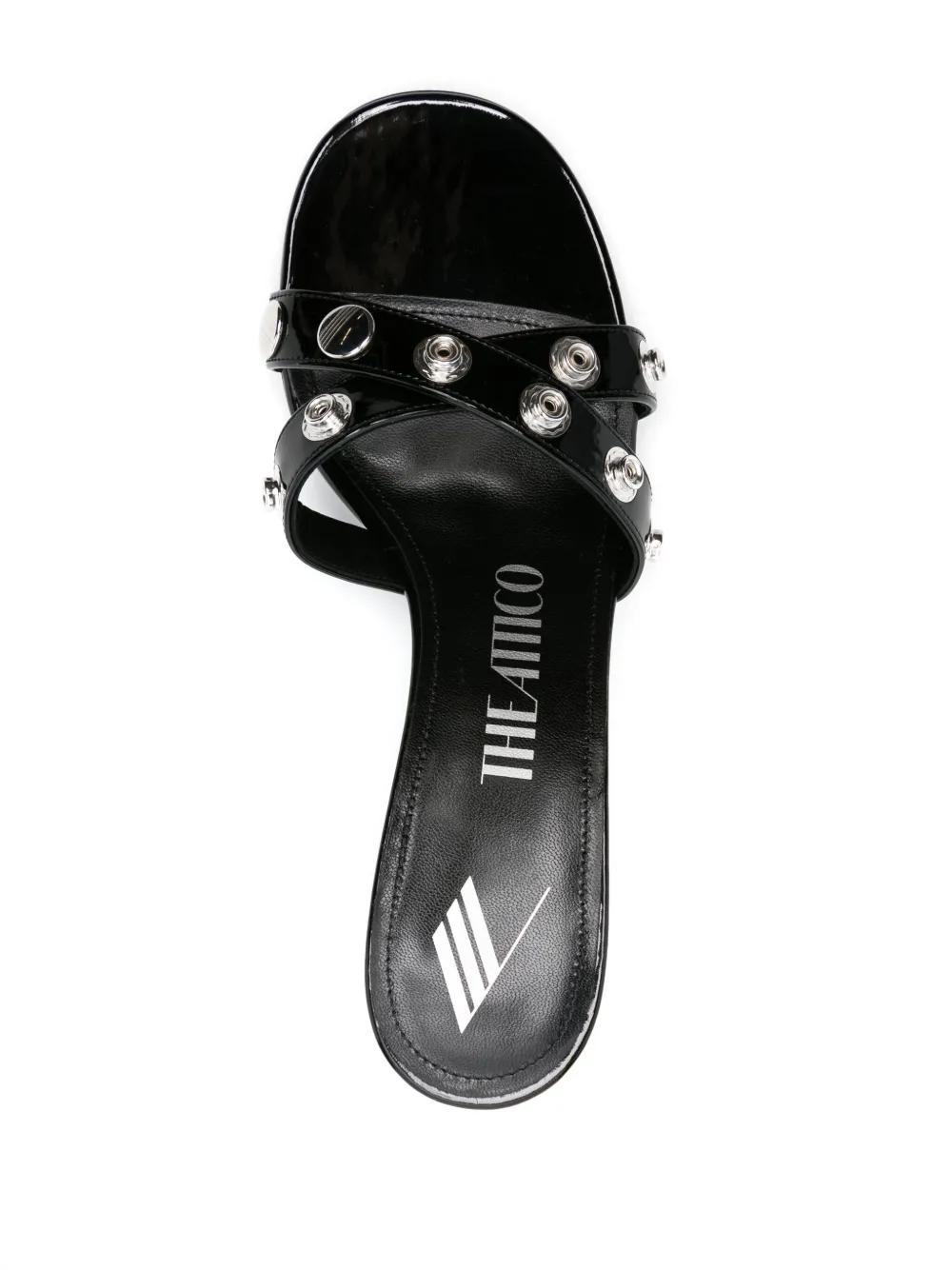 black calf leather patent finish silver-tone stud detailing slip-on style branded footbed round open toe crossover strap at the toe 60mm mid heel