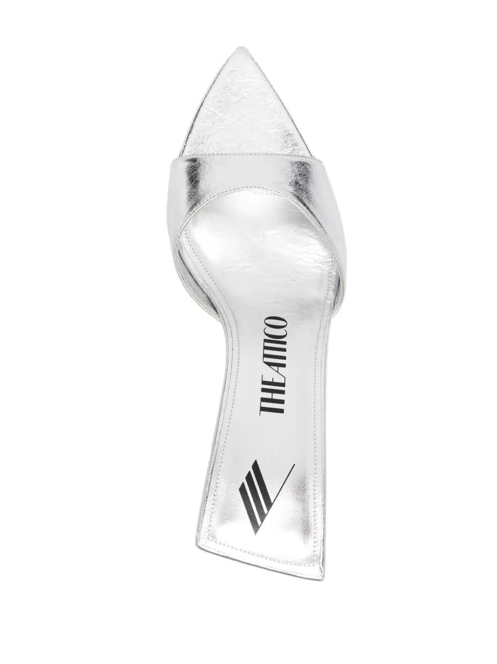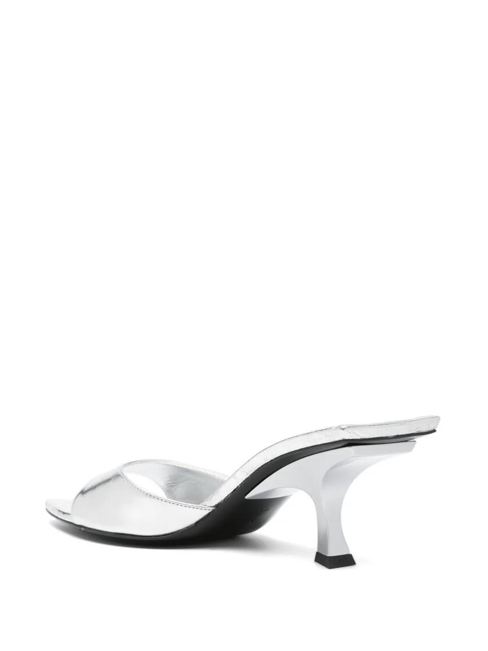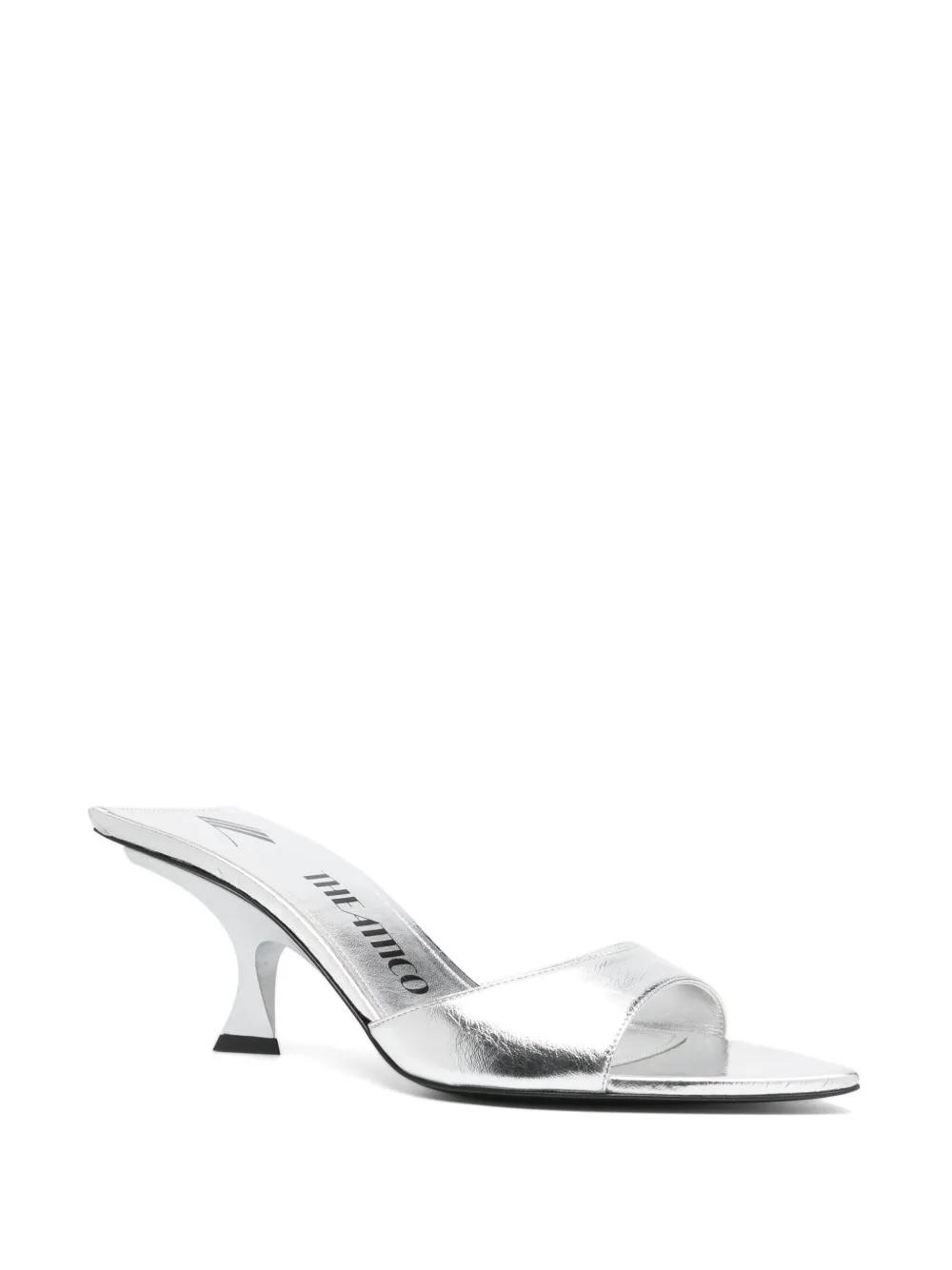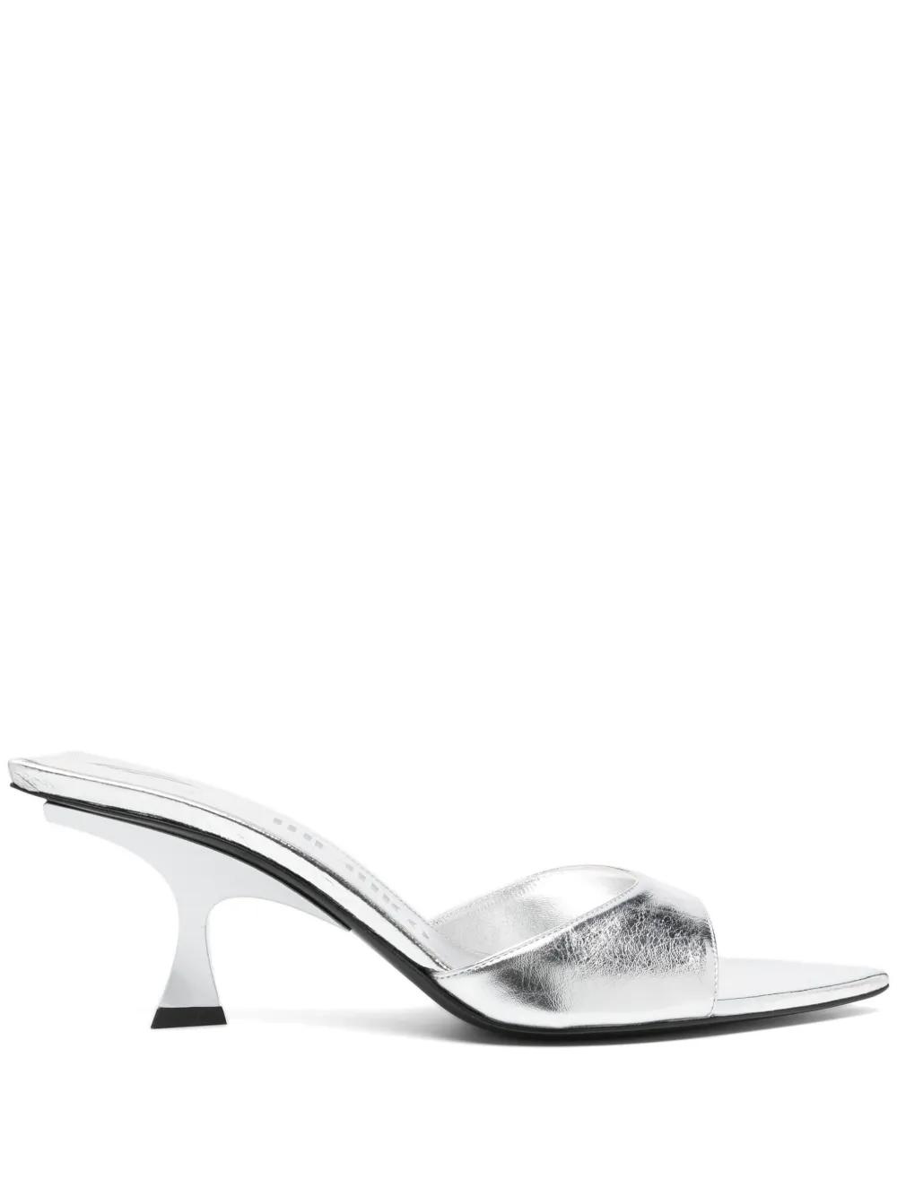 silver-tone calf leather metallic effect crinkled finish slip-on style 70mm mid sculpted heel front strap pointed open toe branded insole leather sole