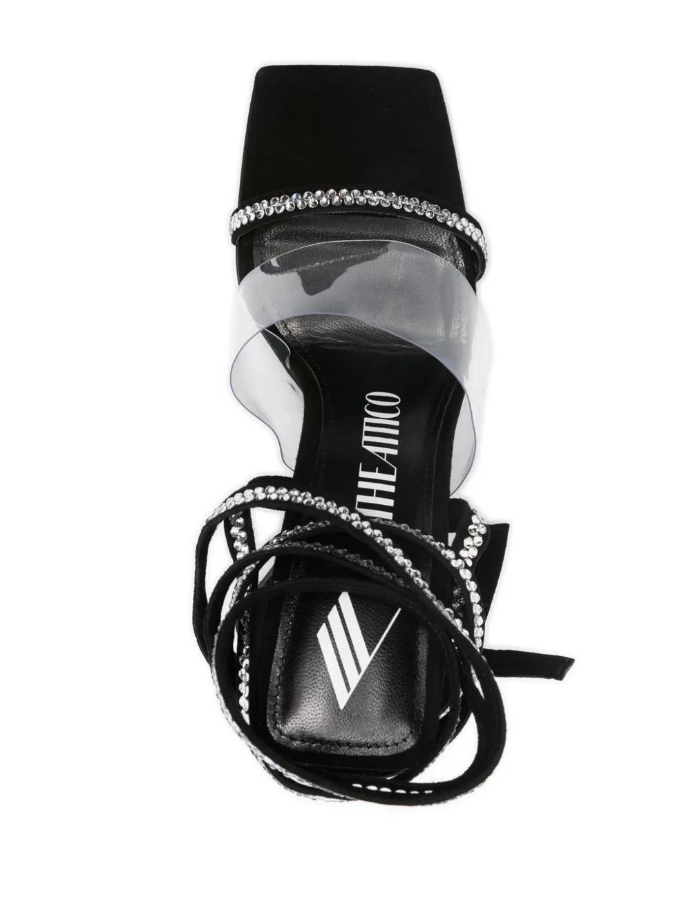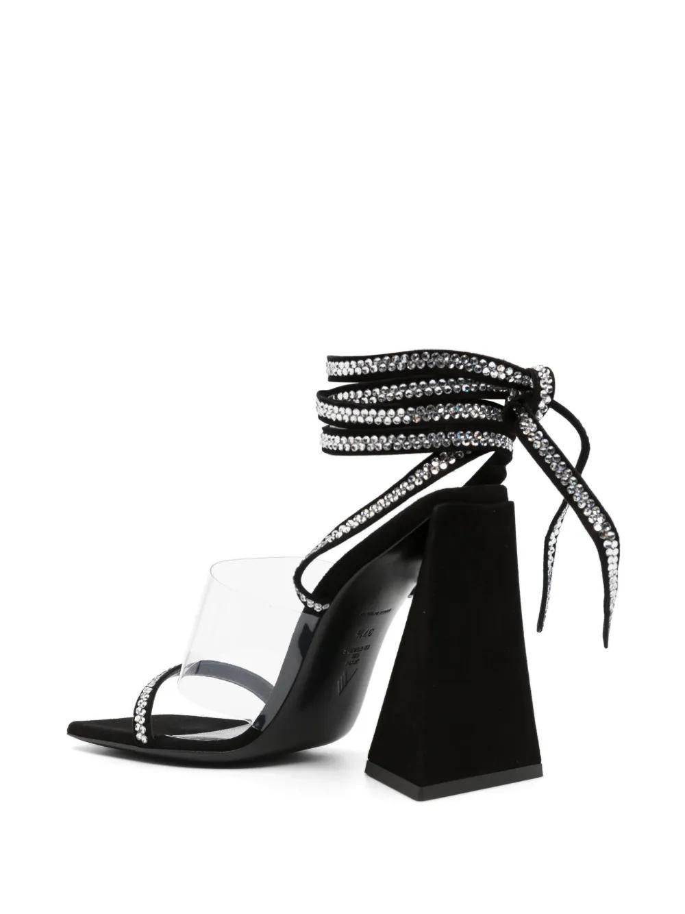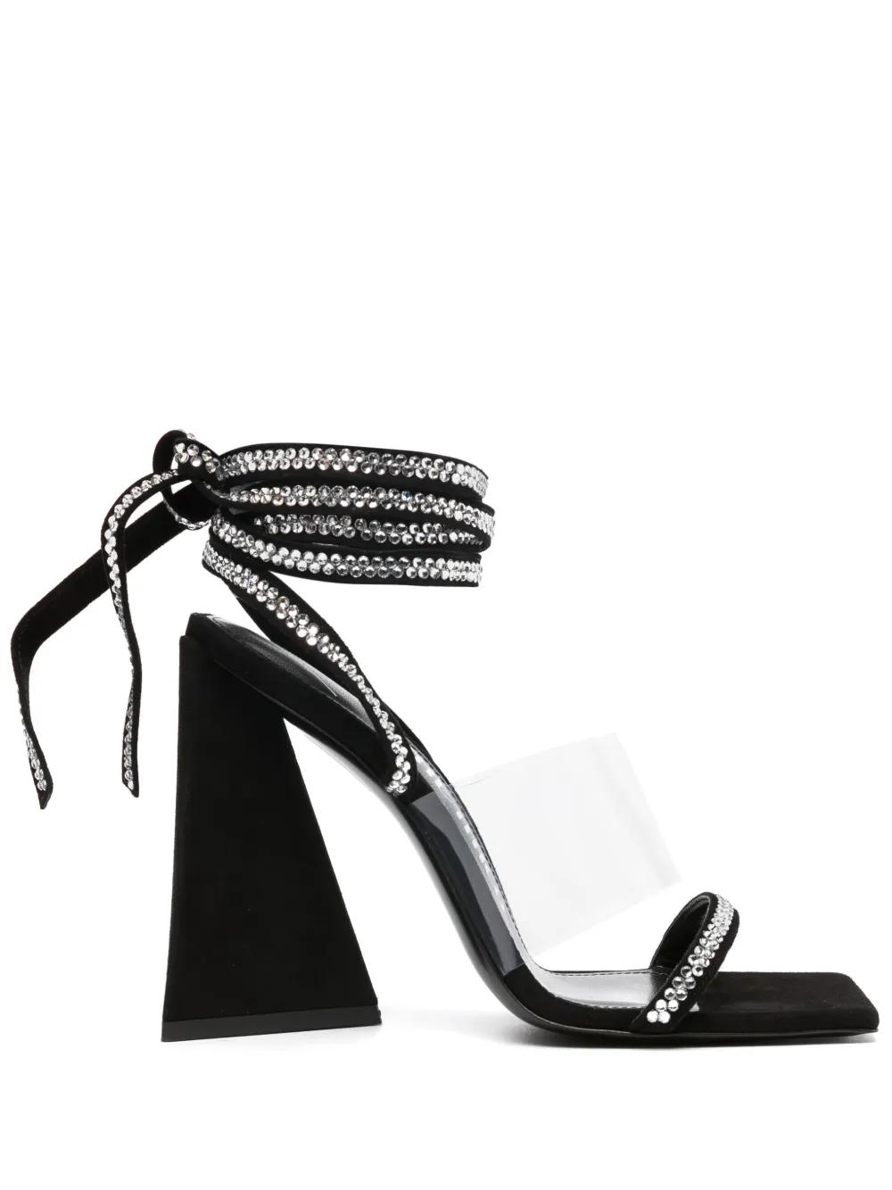 black/silver-tone calf leather rhinestone embellishment square toe wraparound style tie-fastening ankle strap branded insole high block heel