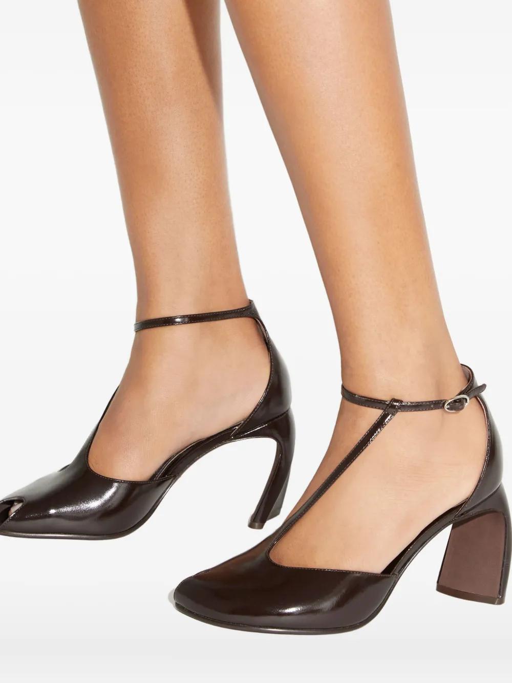 dark brown T-strap peep toe buckle fastening leather